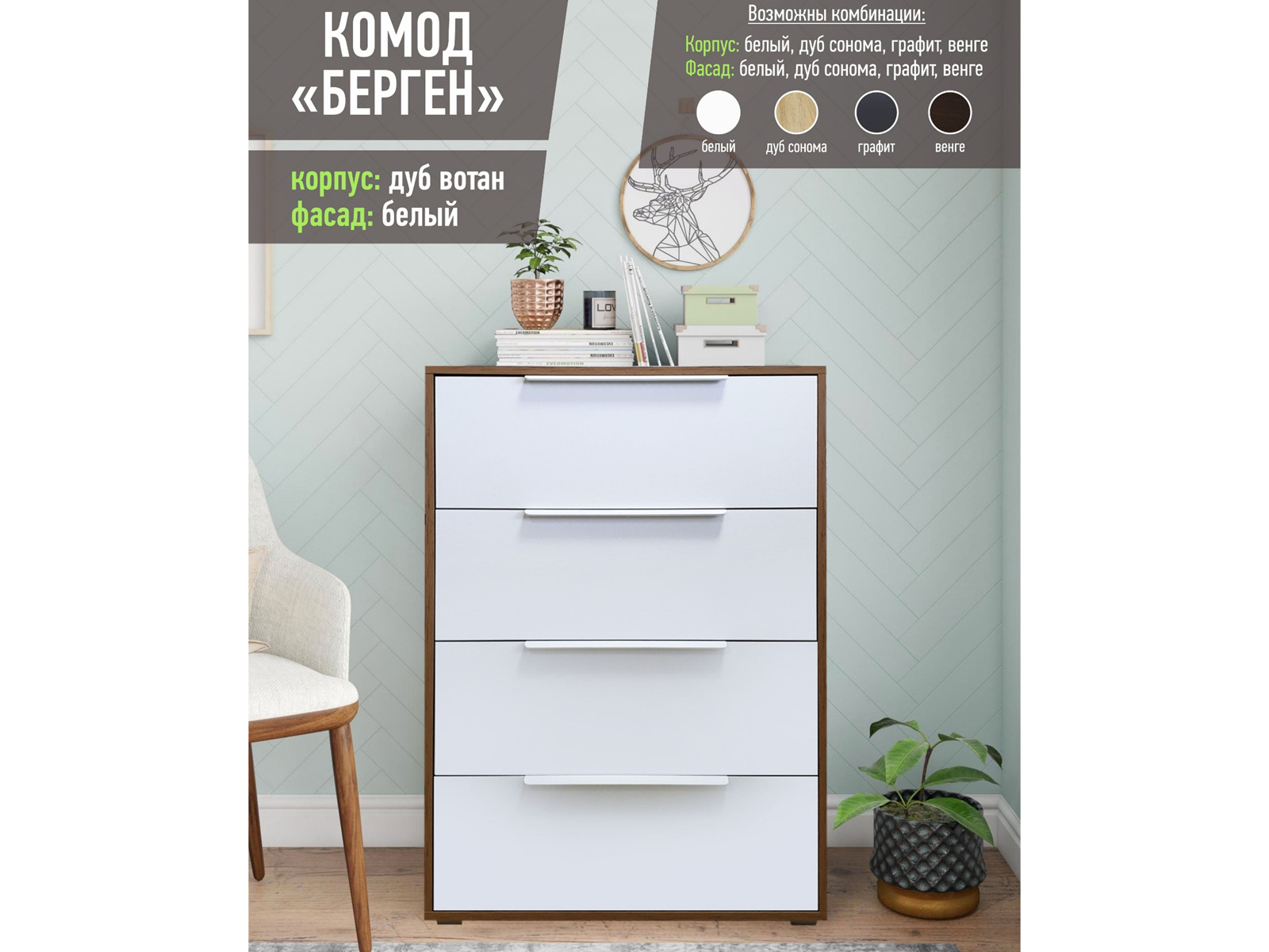 - Фасады: дуб вотан, белый, дуб сонома, дуб табачный