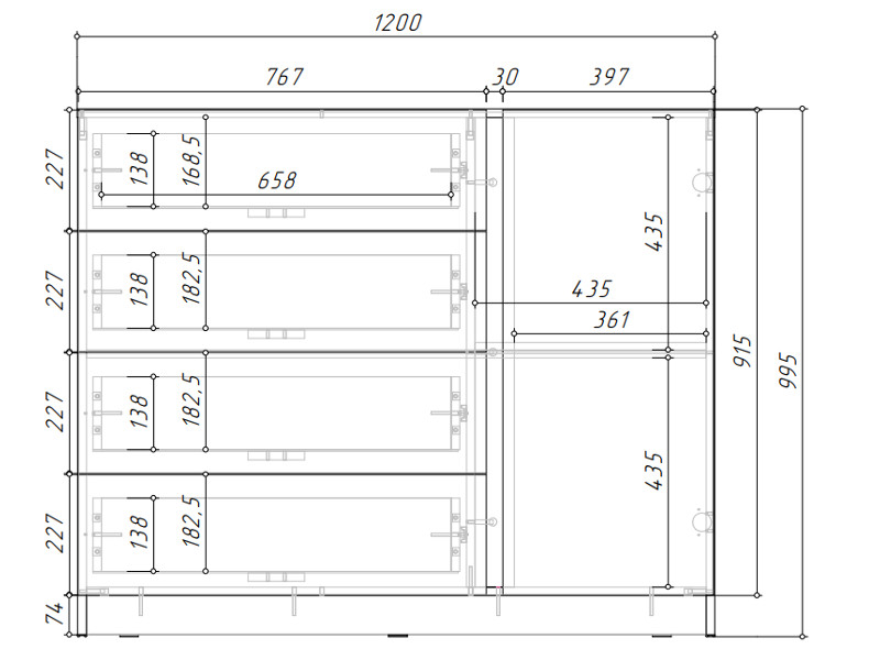 Изделие имеет универсальную сборку: ящики(4шт.) справа/слева, открывание створки (1шт.) соответственно налево/направо)