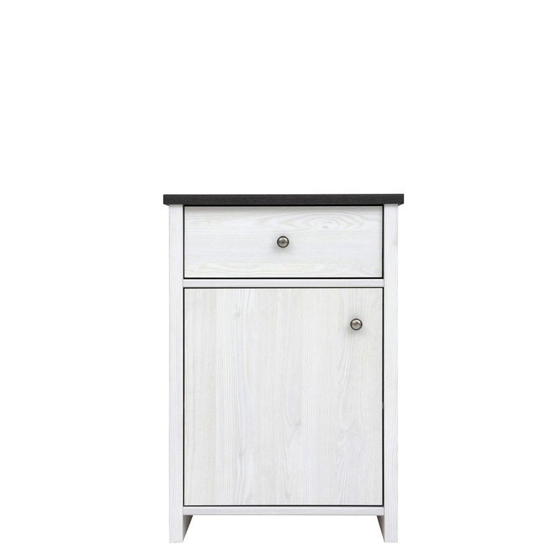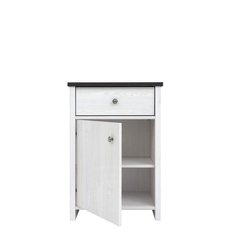 Комод разделен на 2 отделения: выдвижной ящик на металлических роликовых направляющих и отделение с полкой за распашными глухими дверями; Дверь может устанавливаться как с правой стороны, так и с левой.