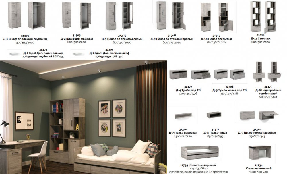Цена за комплект: Кровать с ящиками, Стол письменный, Д-10 Пенал открытый, Д-11 Стеллаж