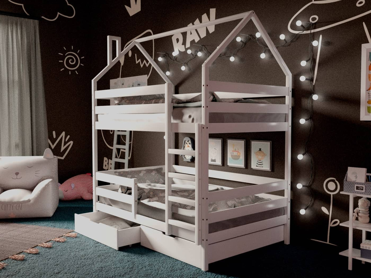 - Двухъярусная кровать-домик белый 80х190 см с ящиками