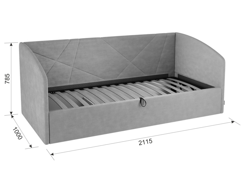 Основание подъемное входит в комплект кровати, петелька для подъема в цвет ткани на корпусе. Кровать имеет огромный ящик для хранения.