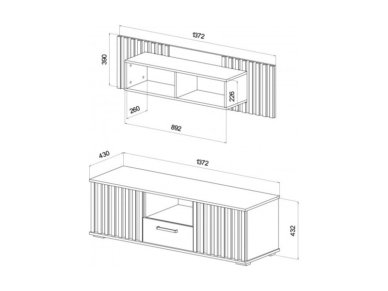 Габариты ТВ тумбы: 1372(ширина) х 420(глубина) х 432(высота) мм.