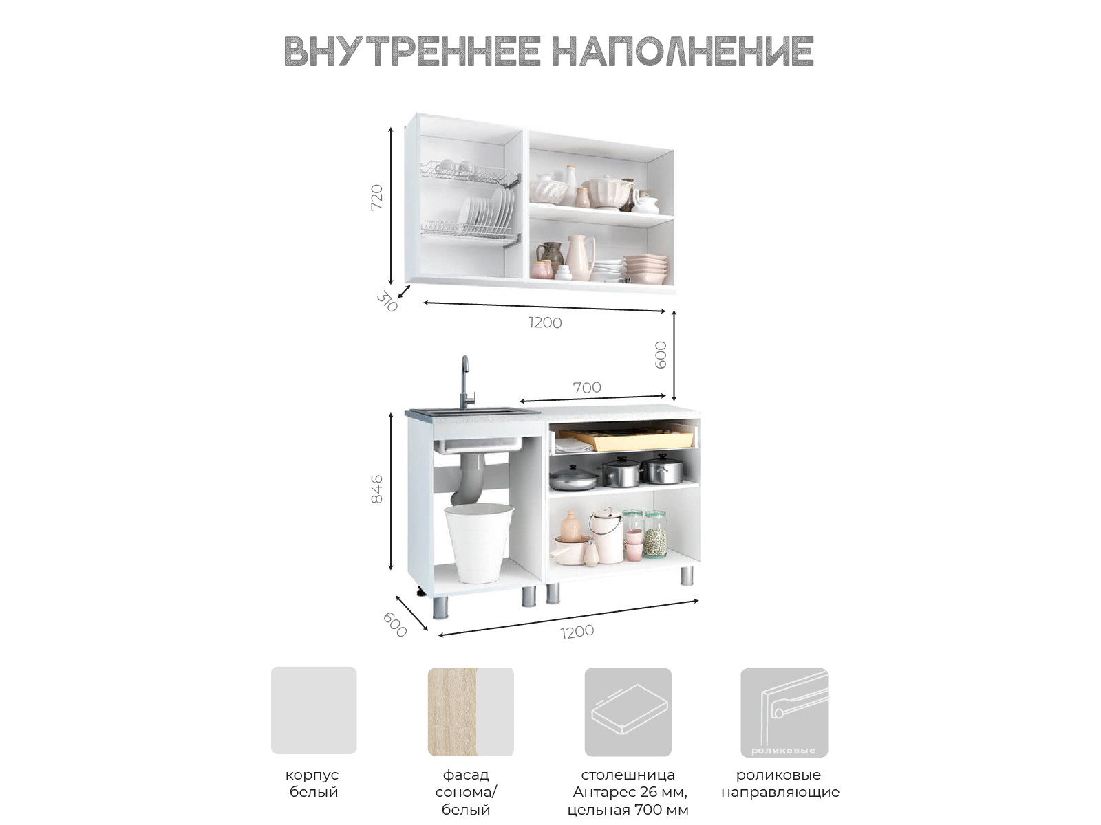 Габаритные размеры композиции нижних модулей с учётом столешницы: ширина - 1200 мм, высота - 846 мм, глубина - 595 мм.