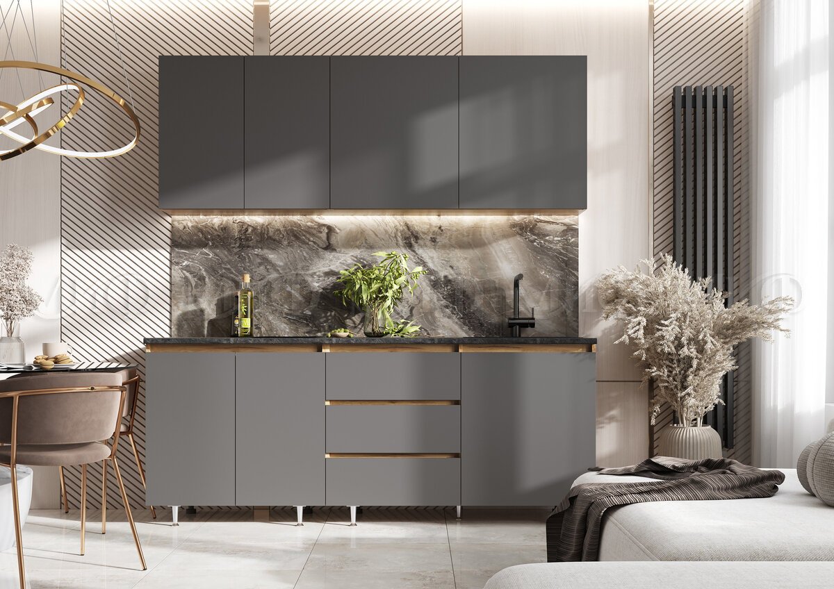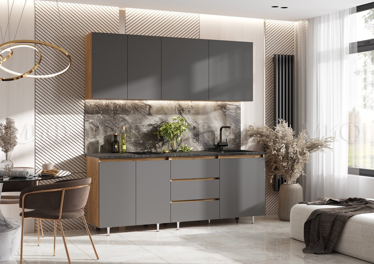 - Кухня Челси 2000 мм Компановка №2 Графит, Дуб Крафт (Кастилло)