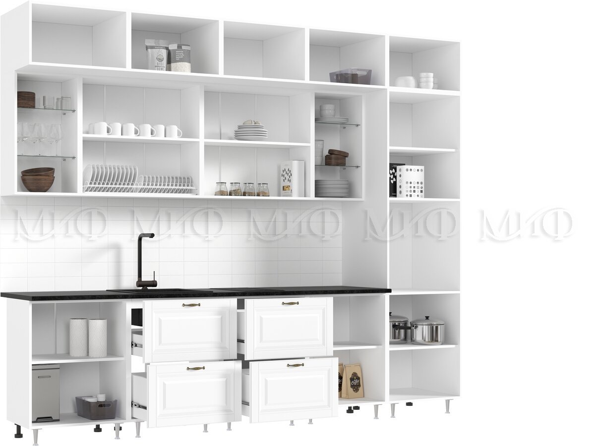 - Кухня Престиж 3000 мм Компоновка №2 Браш Вайт/Прайм орех