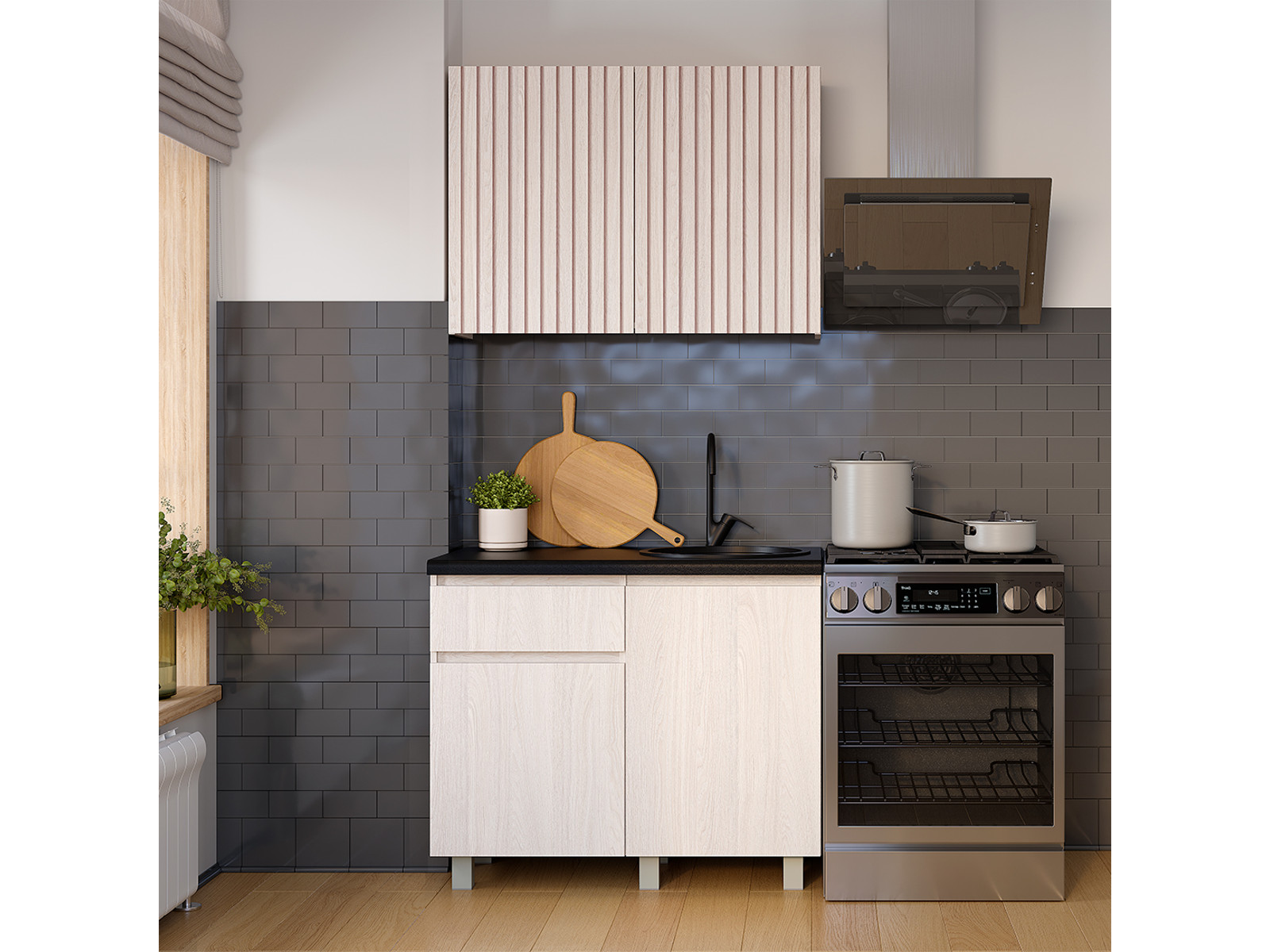 Цвет: ясень белый, на верхних фасадах оригинальная фотопечать - имитация реек.