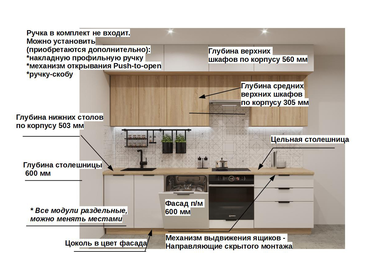 Кухонная мойка, стеновая панель, посудосушитель, планки для столешницы в комплект не входят.