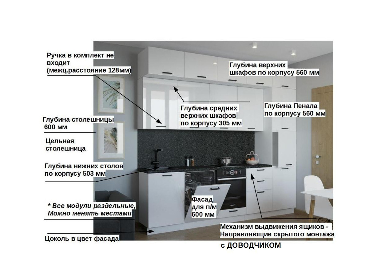 Кухонная мойка, стеновая панель, посудосушитель, планки для столешницы в комплект не входят.