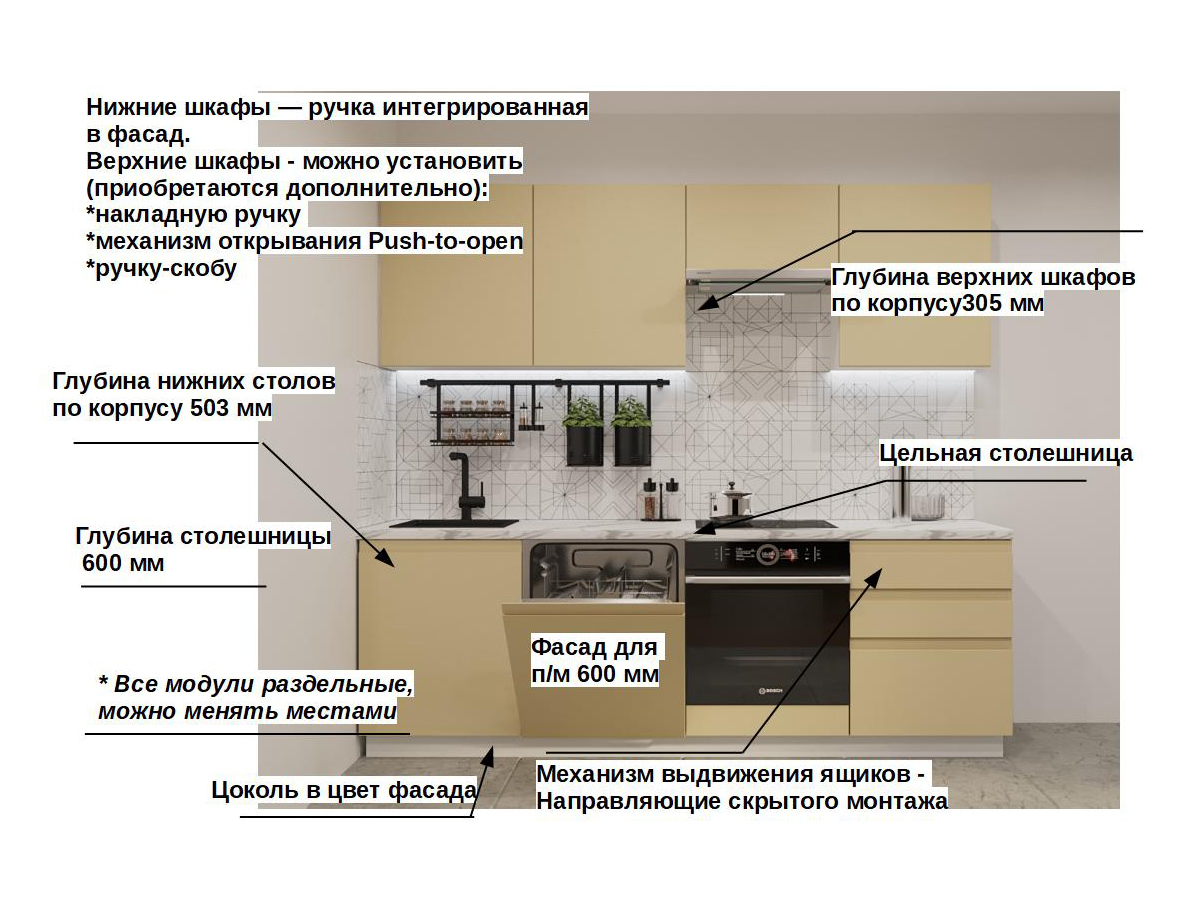 Кухонная мойка, стеновая панель, посудосушитель, планки для столешницы в комплект не входят.