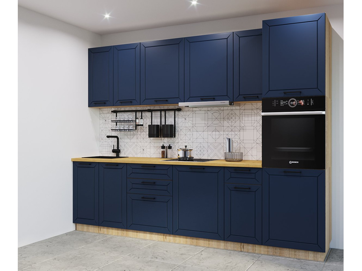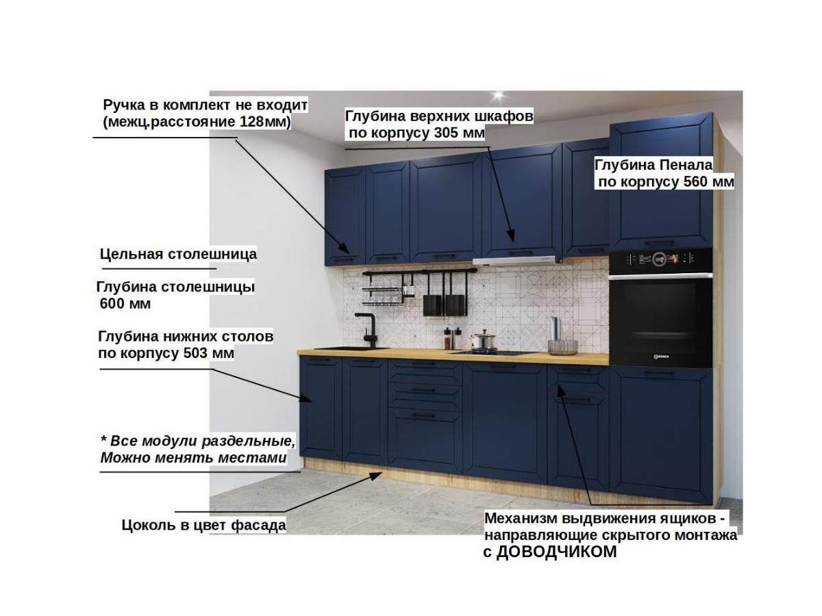 Кухонная мойка, стеновая панель, посудосушитель, планки для столешницы в комплект не входят.