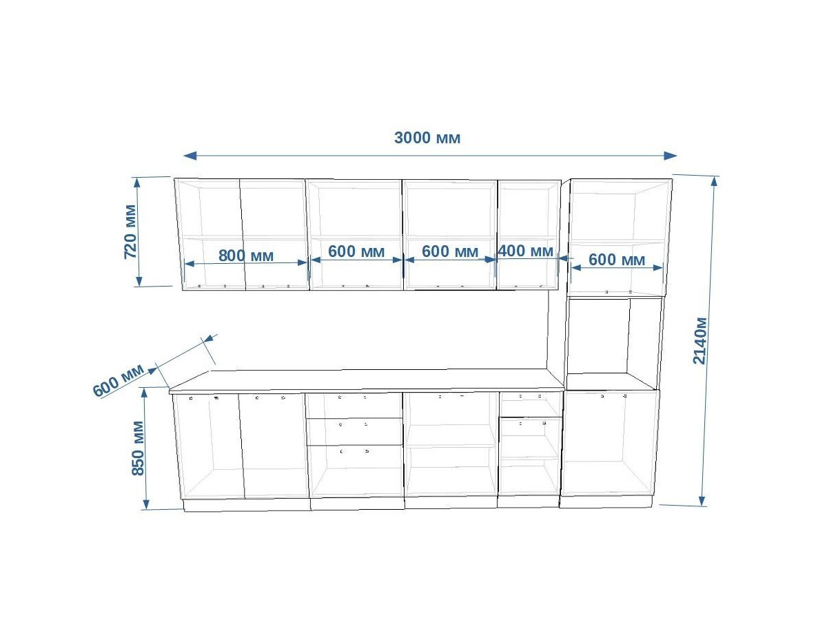 - высота верхних шкафов 720 мм
