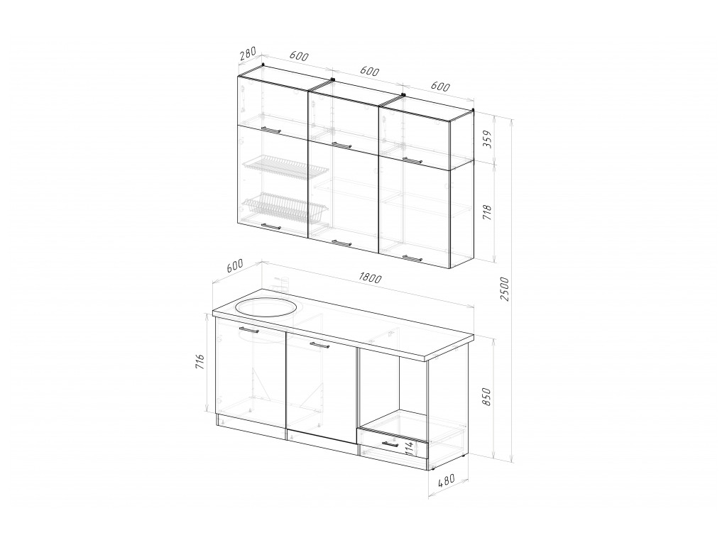 Мойка, смеситель, стеновая панель и посудосушитель в комплект гарнитура не входят.