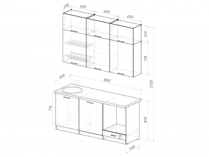 Мойка, смеситель, стеновая панель и посудосушитель в комплект гарнитура не входят.