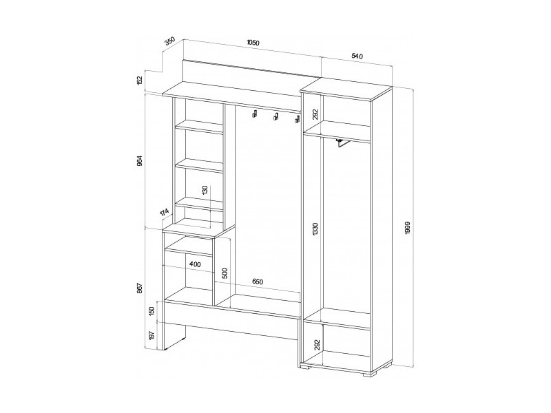 Габариты: 1590 (ширина) х 350 (глубина) х 1999 (высота) мм.