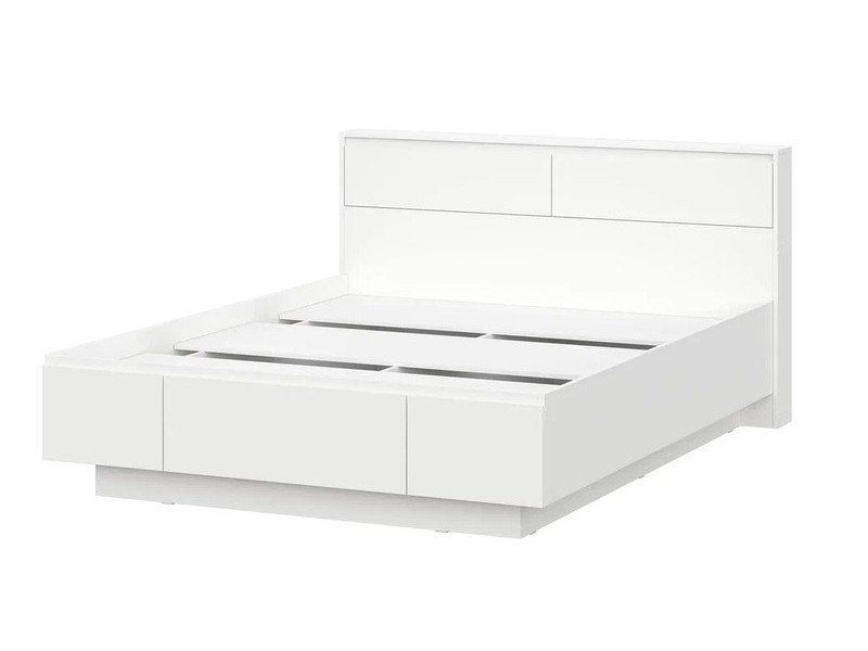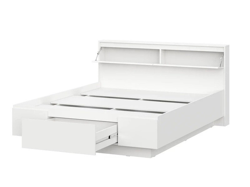 Подиумная система опоры кровати создает парящий эффект и придает грациозности интерьеру. Массивное изголовье оборудовано двумя скрытыми ящикам с откидными створками для хранения необходимых в зоне сна предметов. Нижний щеток кровати в своей центральной части имеет крупногабаритный выкатной ящик с усиленным дном.