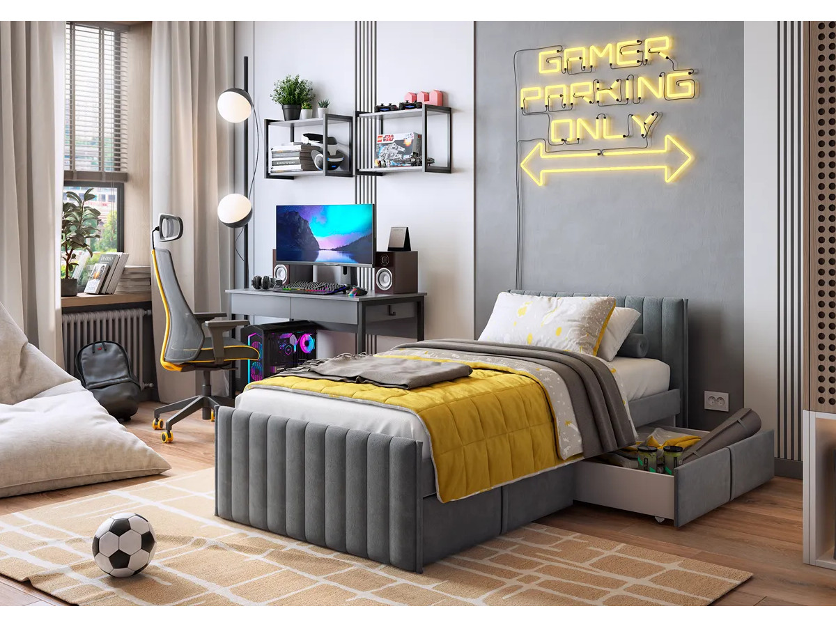 Дополнительно можно приобрести наматрасник в цвет обивки и мягкий ограничитель.