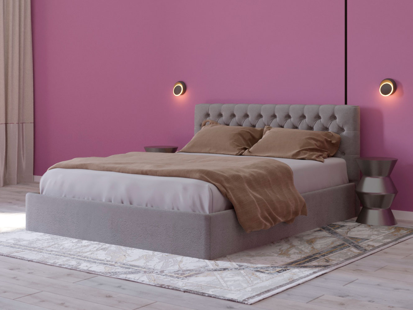 Изголовье: Изголовье оформлено с эффектом каретной стяжки, что создает эффектный акцент в дизайне. Этот элемент не только эстетичен, но и функционален, обеспечивая поддержку во время чтения или отдыха.