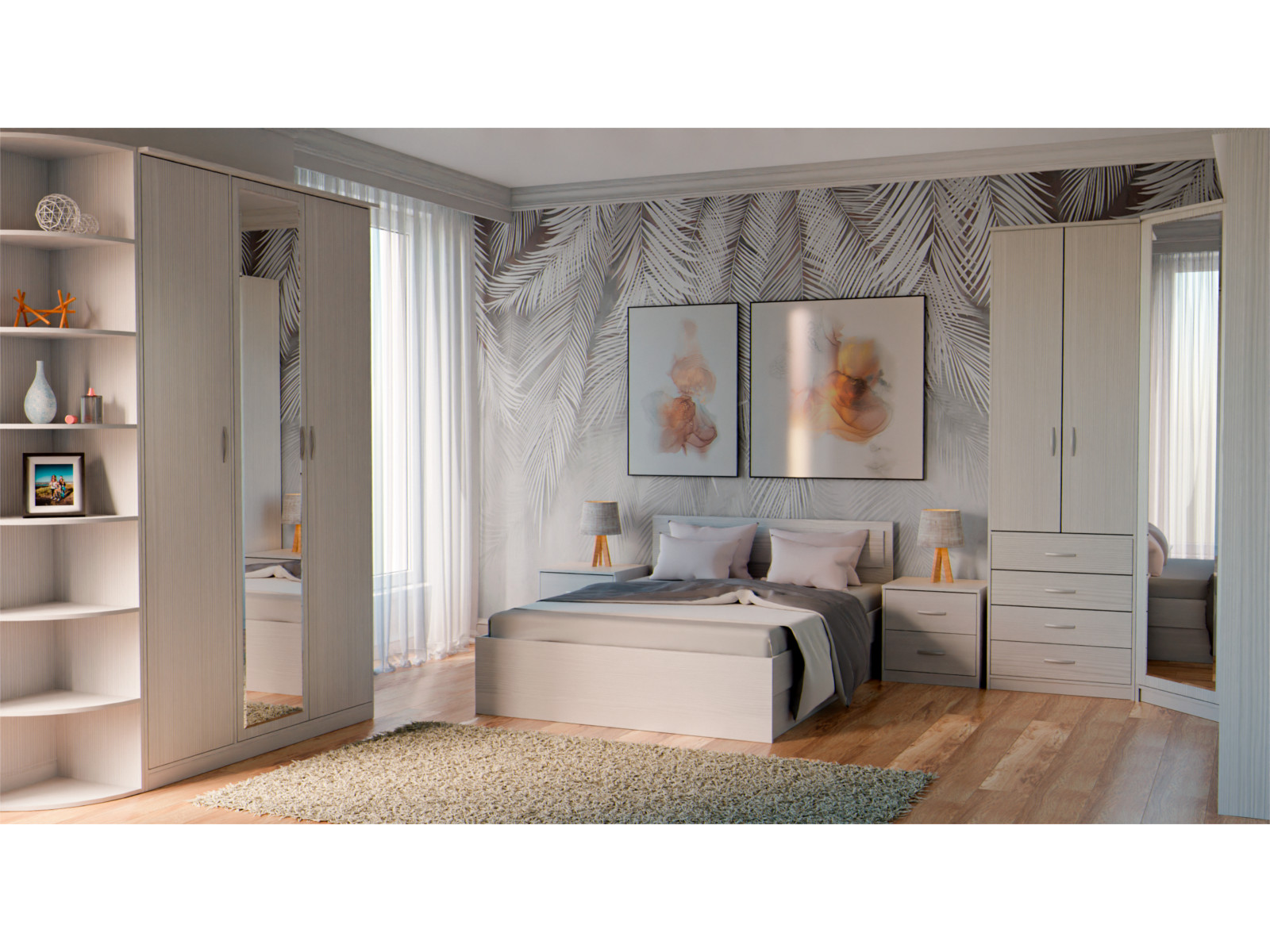 Состав комплекта: кровать-1200, тумба прикроватная - 2шт, шкаф угловой (с зеркалом), шкаф универсальный, шкаф 3-х ств. (с зеркалом) , стеллаж угловой