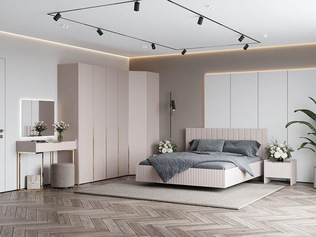 - Декор: Фрезеровка на фасадах, спинках кроватей, царгах