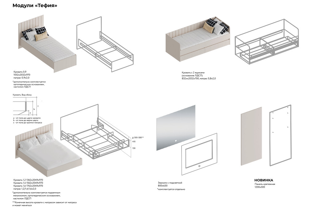 Цена за комплект: Тумба прикроватная, Кровать 1,4, Настил 1400 , Комод 2-створки с 4 ящиками, Шкаф 4-створки с зеркалом