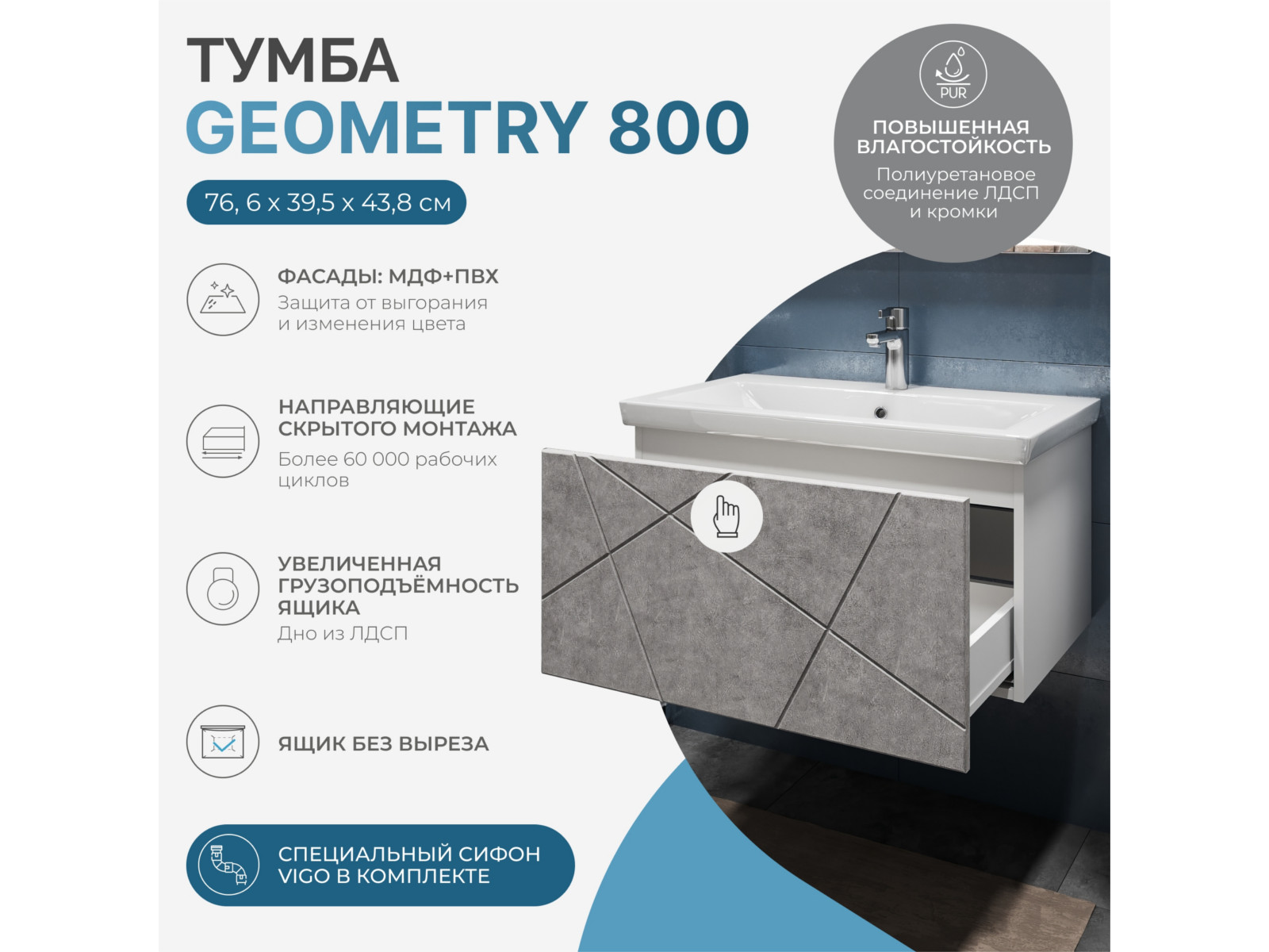 Размер тумбы с раковиной (ШxГxВ): 800x450x420 мм