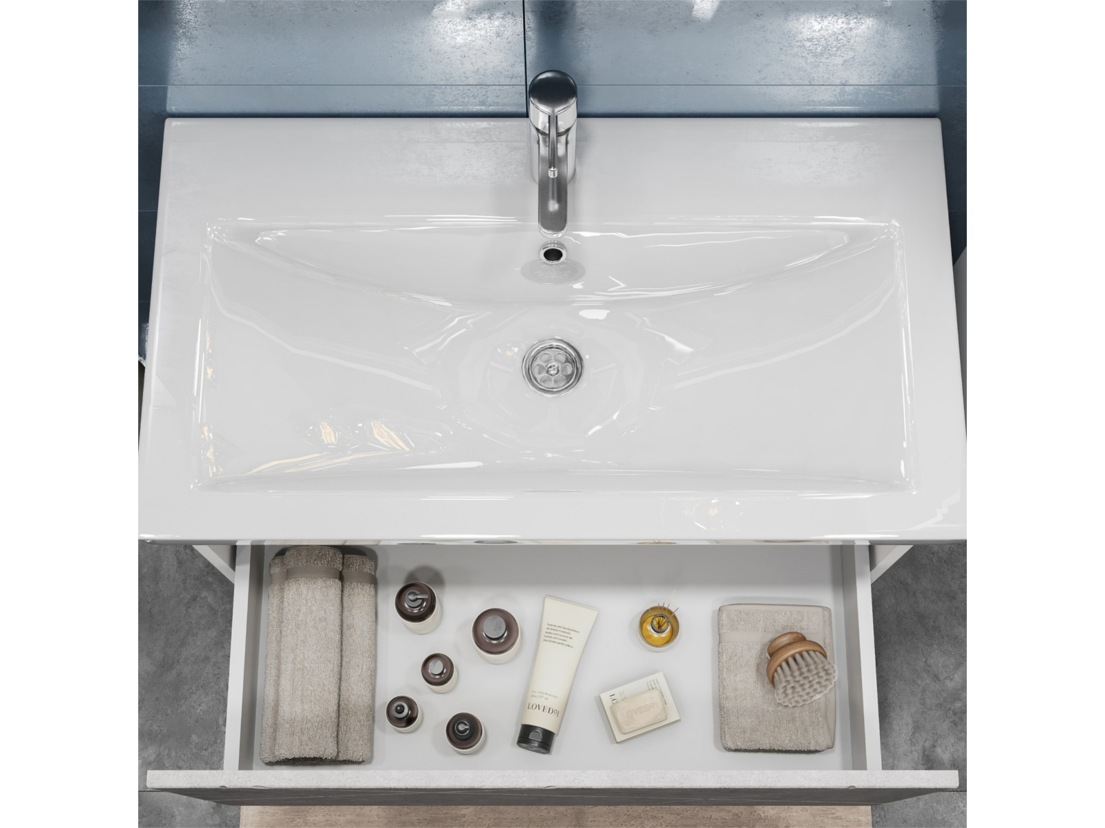Оснащение: 1 выдвижной ящик, направляющие скрытого монтажа, открывание нажатием "push-to-open", 2 навеса, 1 сифон