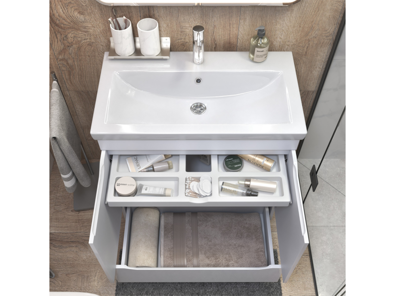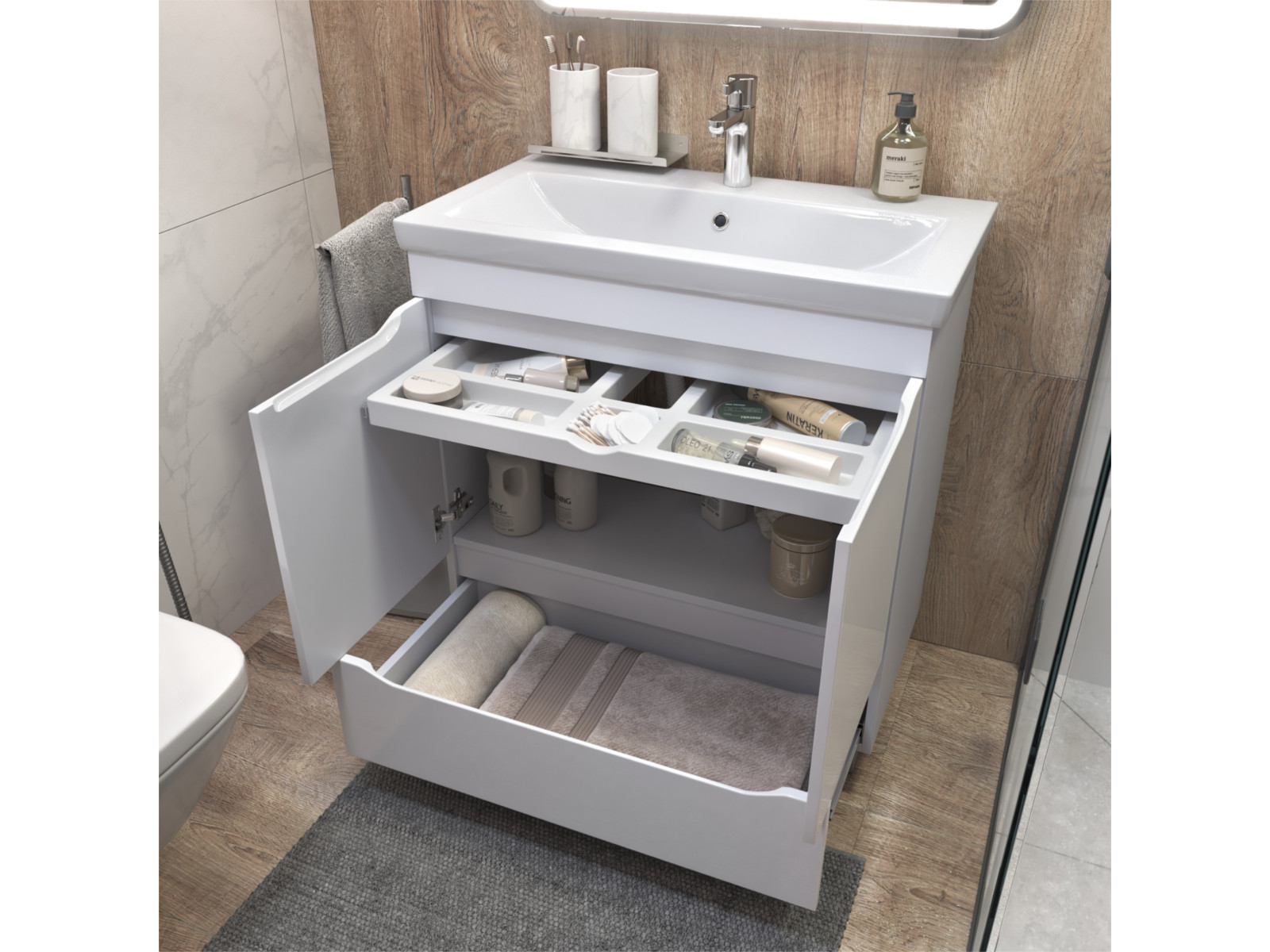 Оснащение: 2 дверцы, петли с механизмом доводчика, 1 ящик, выдвижной органайзер для мелочей, шариковые направляющие полного выдвижения, 2 опоры квадратные регулируемые; 2 кухонные опоры