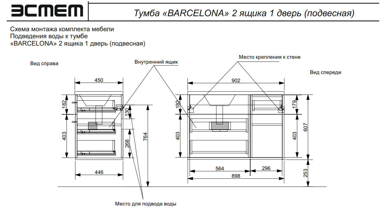 Тумба с раковиной Barcelona 900 левосторонний подвесной 2 ящика 1 дверь