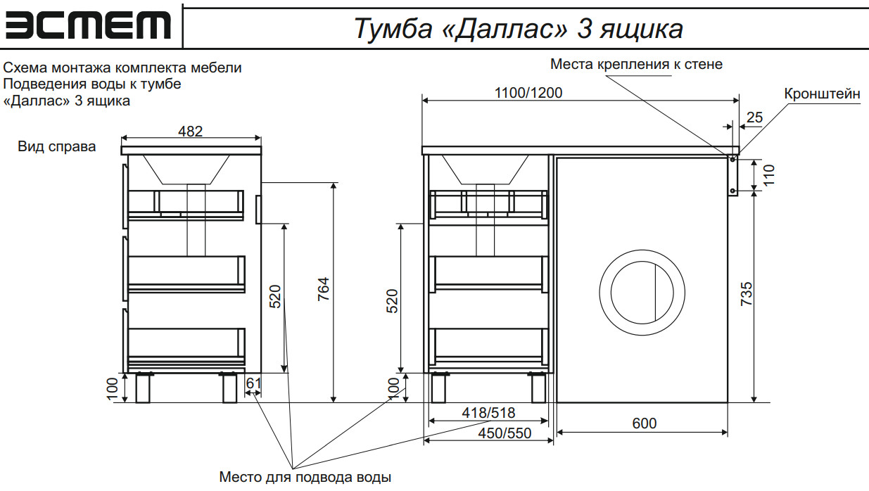 Тумба с раковиной Dallas Luxe 1200 напольная 3 ящика левая