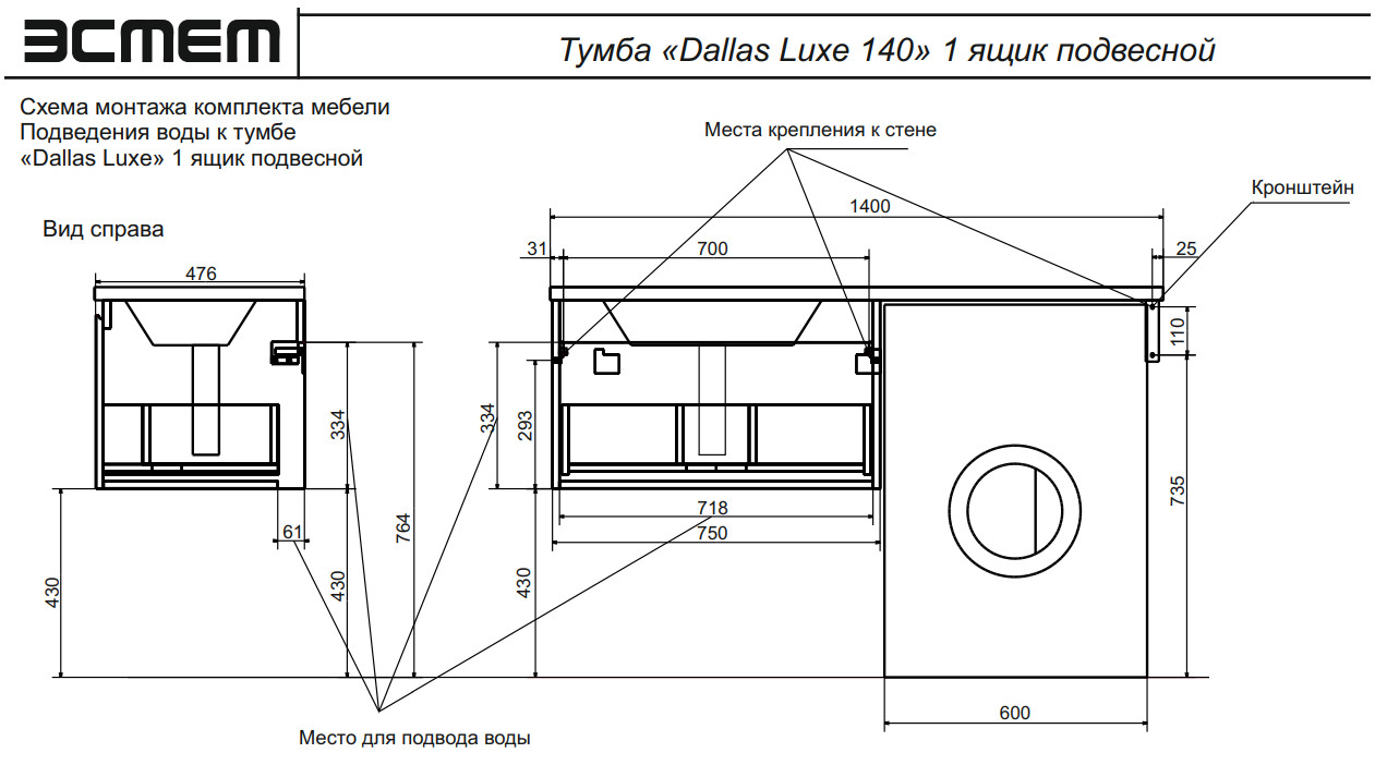 - Тумба с раковиной Dallas Luxe 1400 навесная 1 ящик левая