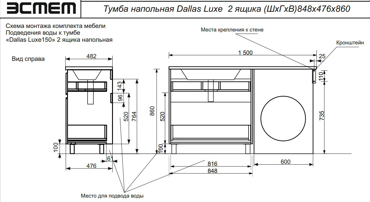 Размер ШхГхВ: 848/1500х476х885 мм