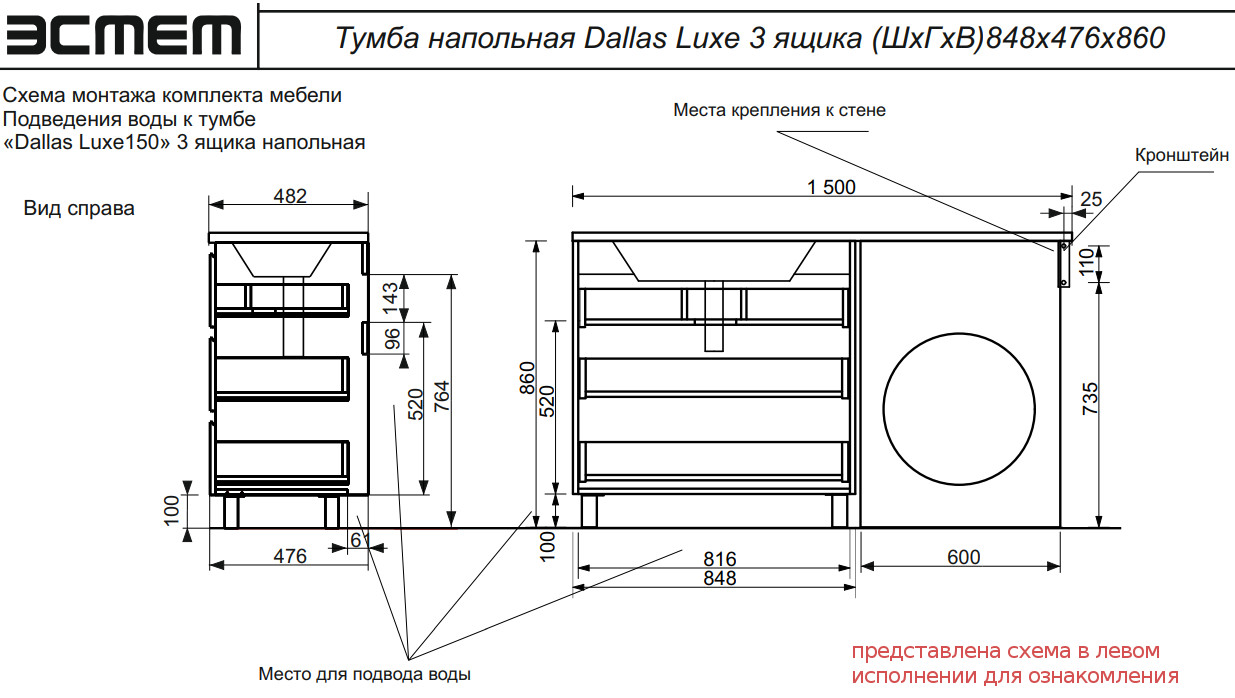 - Тумба с раковиной Dallas Luxe 1500 напольная 3 ящика правая