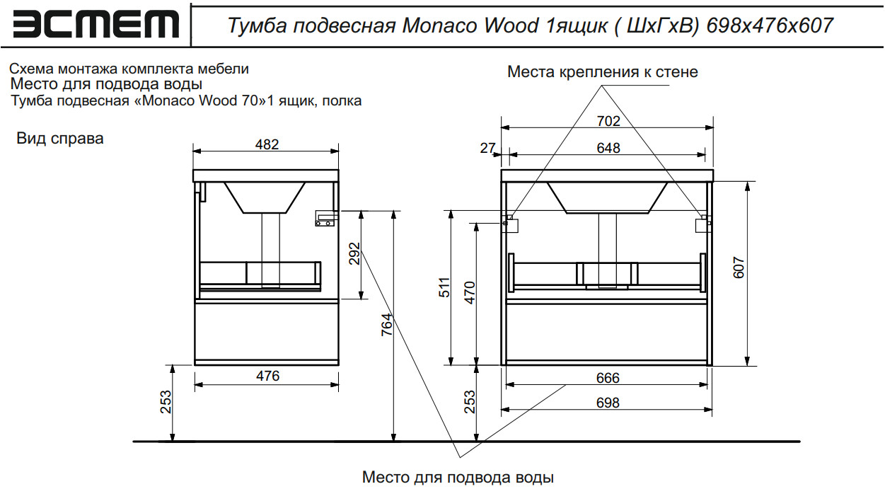 - Тумба с раковиной Monaco Wood 700 1 ящик с нишей