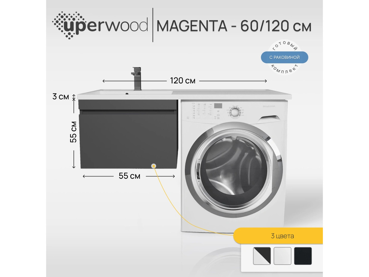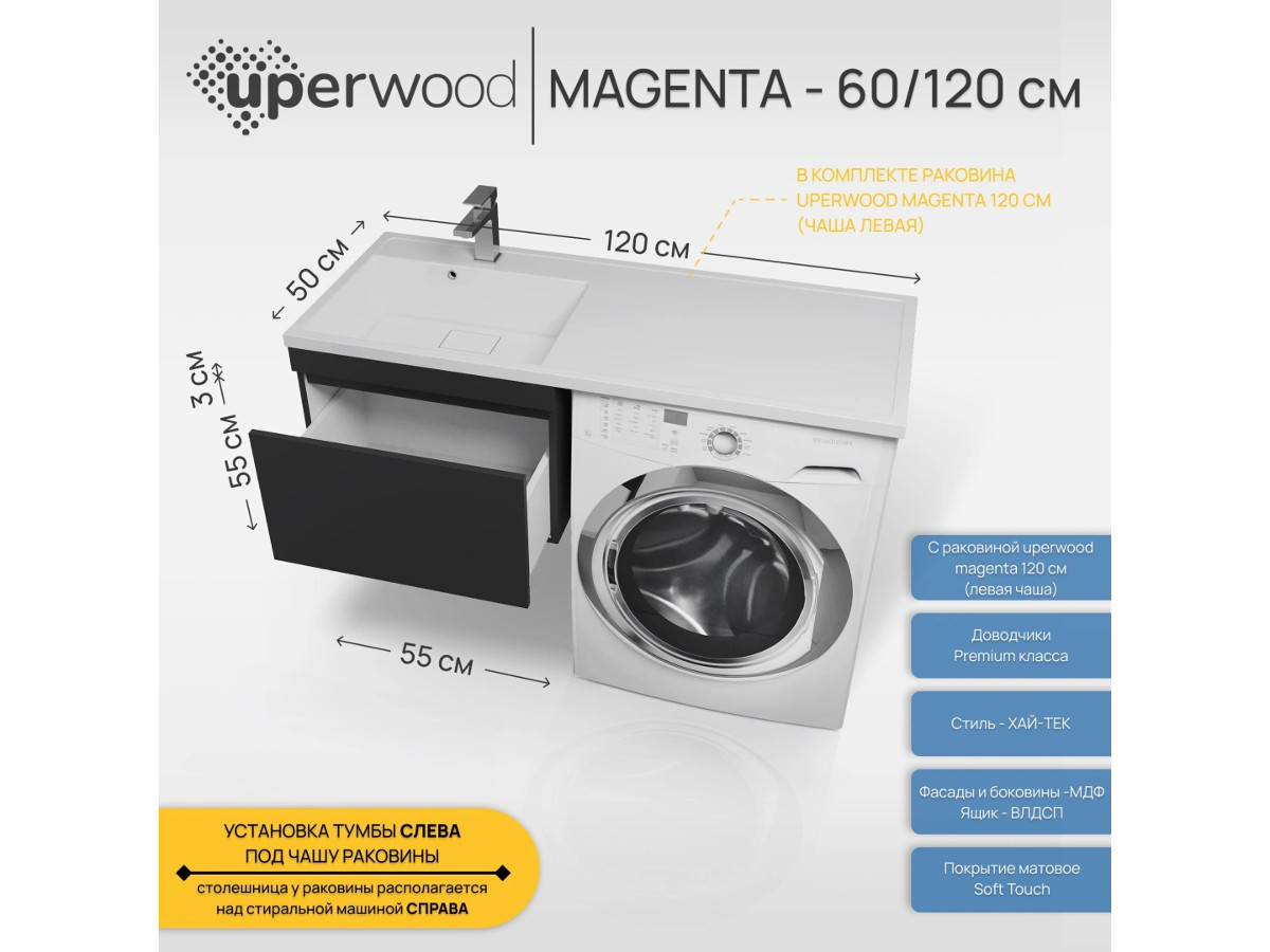 Тумба с раковиной Uperwood Magenta 60-120 см подвесная черная выдвижной ящик левая