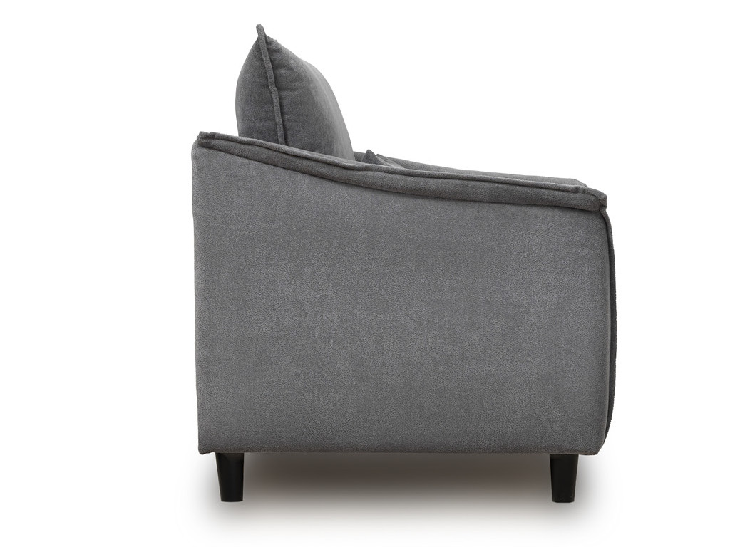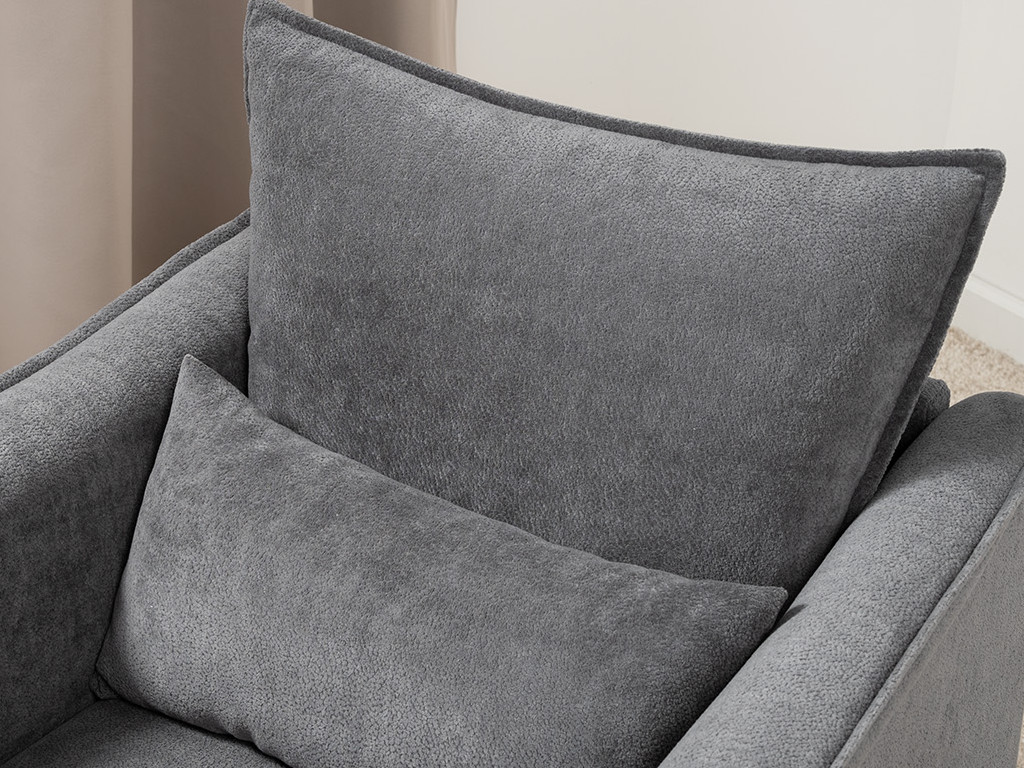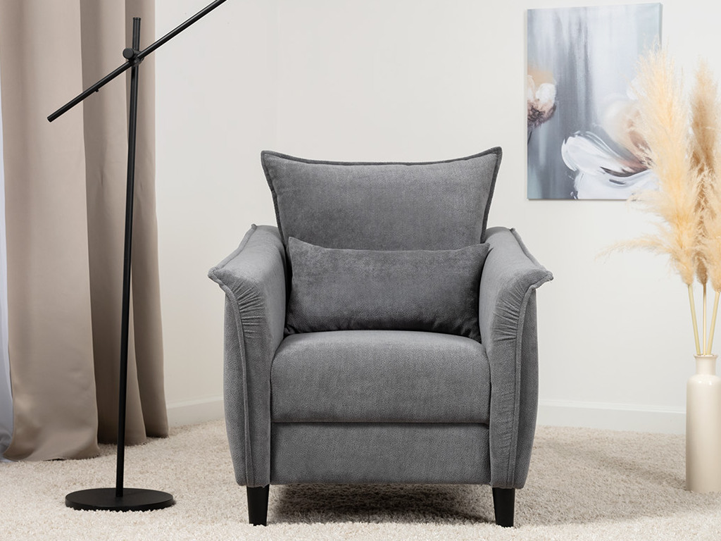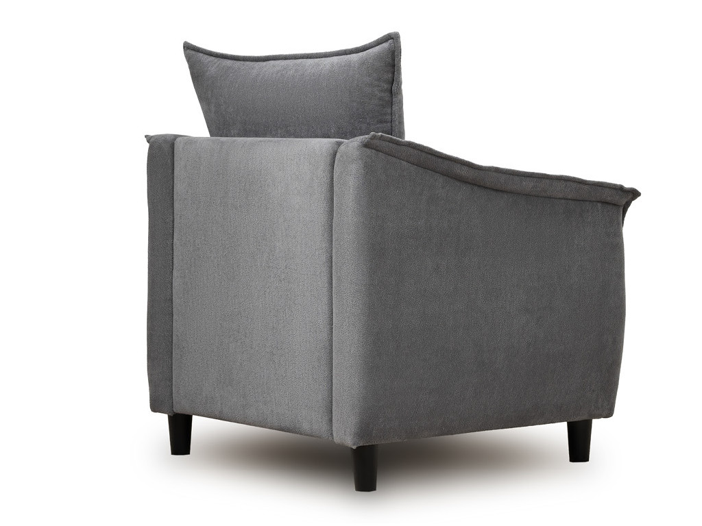 Кресло с приспинной подушкой трапецивидной формы на молнии, по трем сторонам которой проложена отделочная строчка на 1,2 см. По контуру боковин проложен декоративный кант на 1,2 см основной ткани. Кант проходит по центру передней части боковины, а по внутренней верхней части сборка.