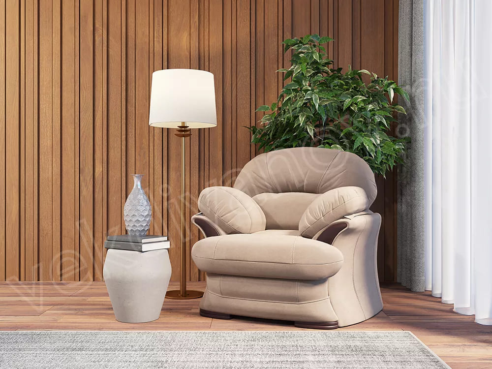 Наполнитель: Спинка и сидение выполнены из высокоэластичного пенополиуретана в сочетании с пружиной змейкой. Подушки сидения выполнены из высокоэластичного пенополиуретана повышенной плотности. В подушках спинки и в подушках подлокотников – гипоаллергенный пух «комфорель». Декоративные элементы выполнены из МДФ.