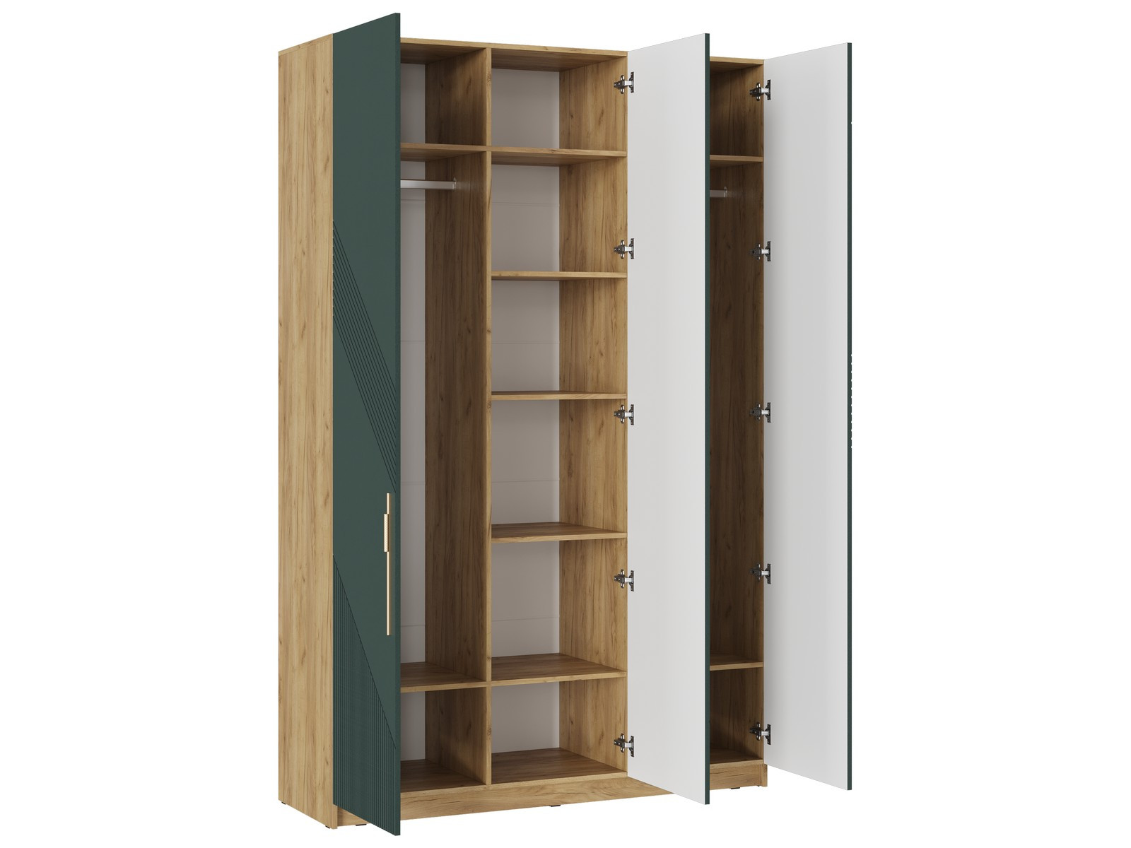 Две оставшиеся секции, габаритами Д.482хВ.2254хГ.490мм., расположены по бокам от центральной и идентичны друг другу. В низу и наверху имеются несъемные полки-вязки, пространство над и под которыми по 300мм. Между полками имеется пространство в 1622мм высотой и 490мм глубиной, в котором расположена овальная металлическая штанга на металлических штангодержателях для одежды. Штанга располагается на высоте 1957мм. от уровня пола, расстояние от штанги до нижней вязки – 1546мм