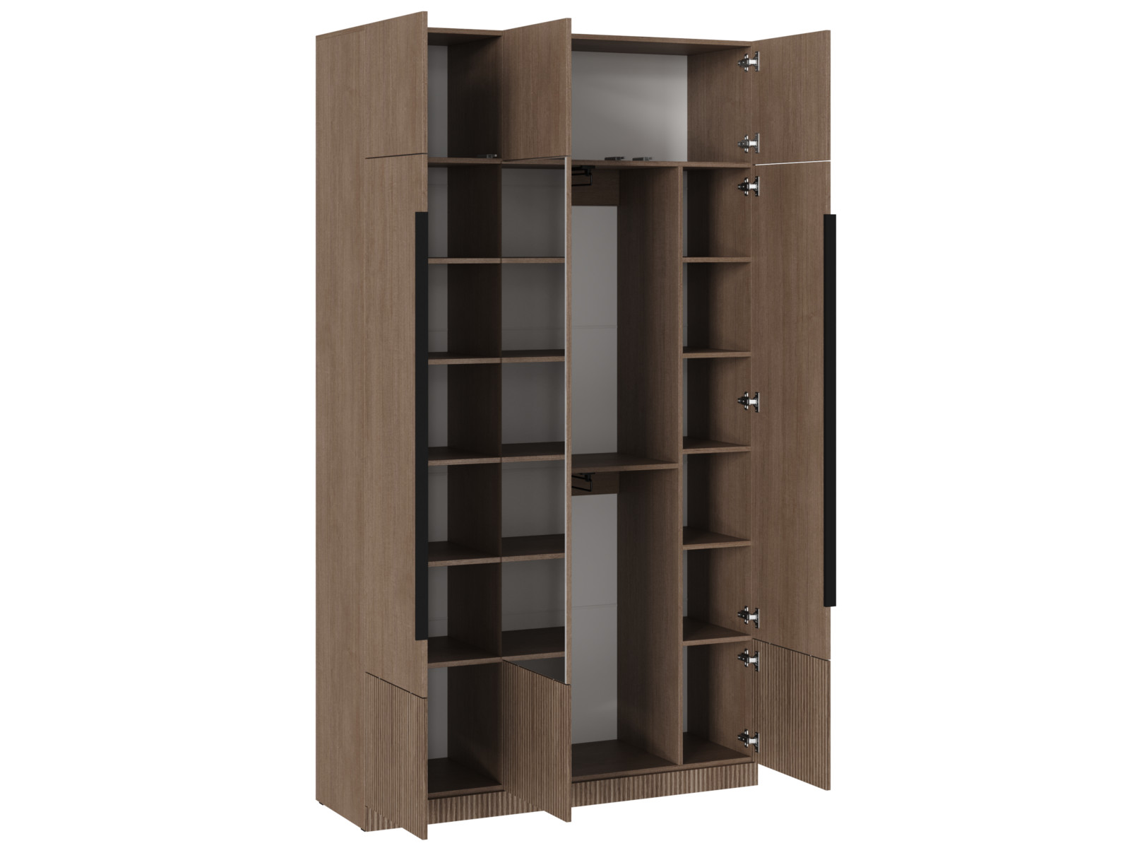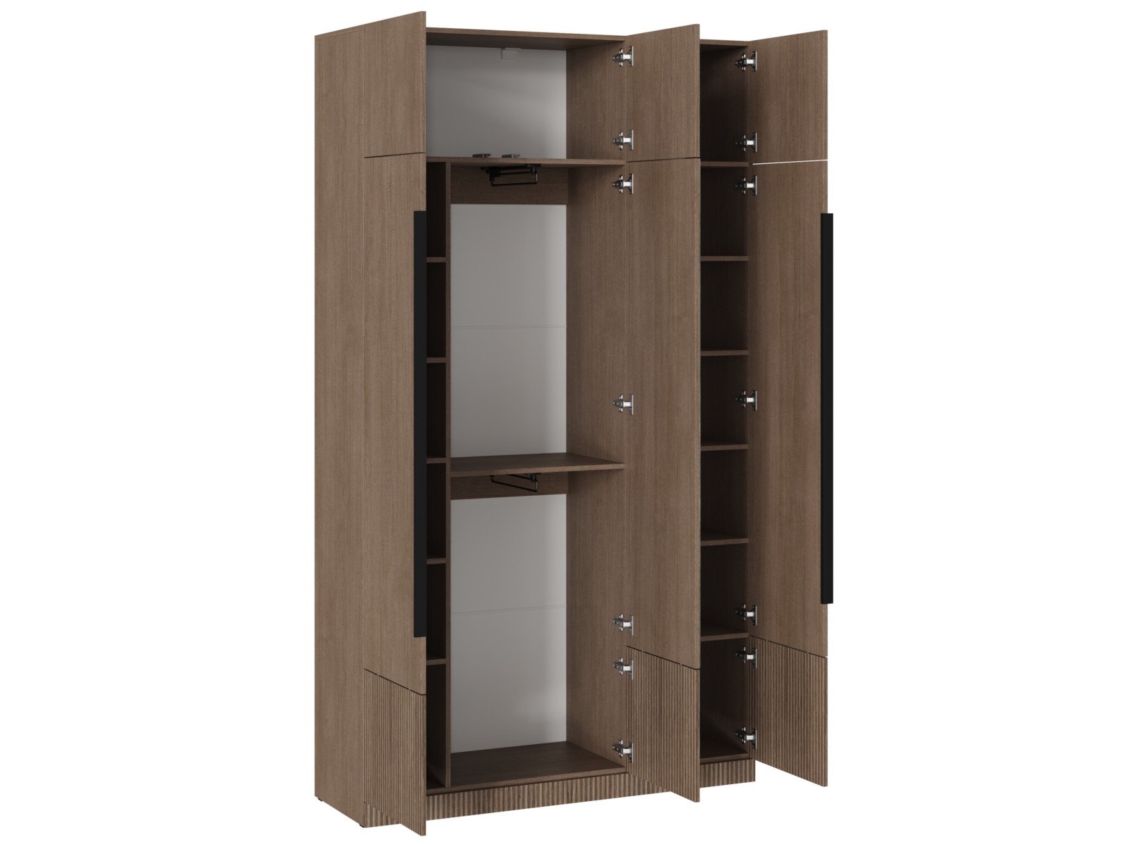 В нижней части КАНТРИ Шкафа ШК-002 (3-ств.с зеркалом) имеются 2 перегородки. С одной стороны перегородка создает отсек шириной 434 мм. В отсеке 5 полок (расстояние между верхними 4-мя полками 289 мм). С противоположной стороны перегородка образует нишу шириной 252 мм.