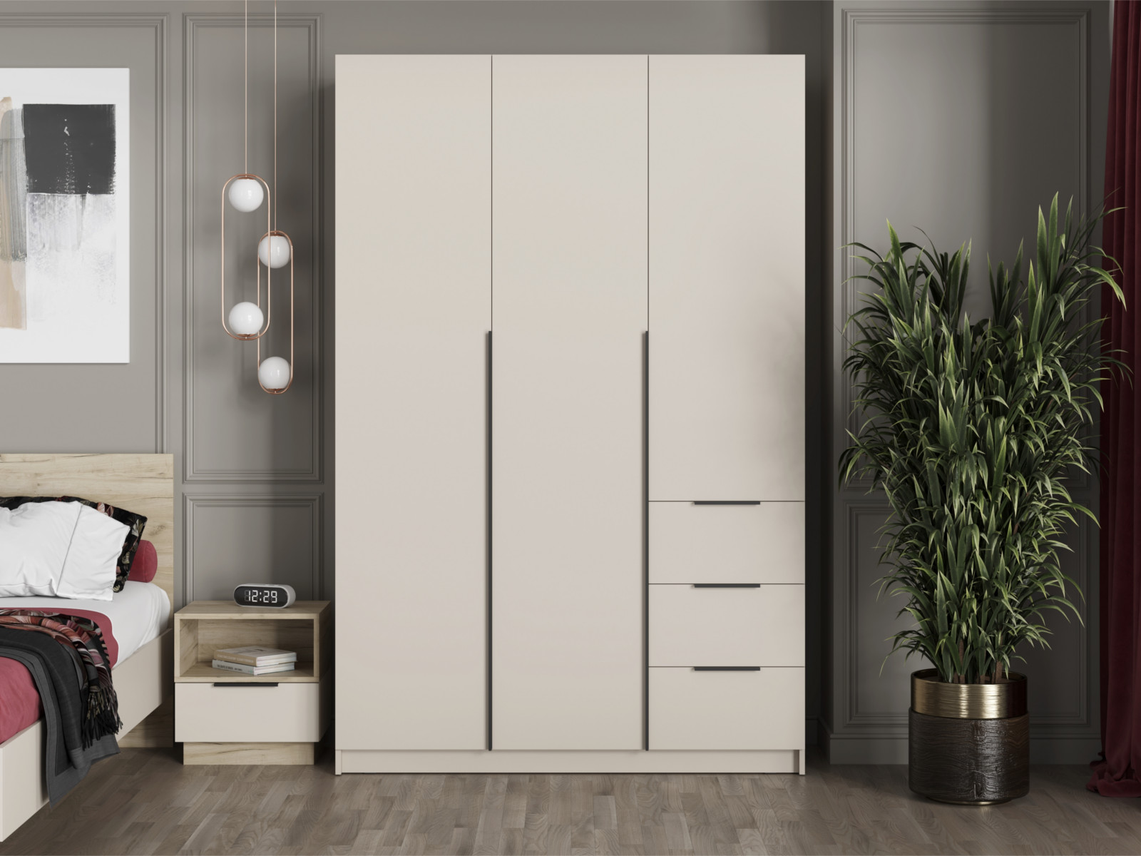 - Две левых створки и фасады ящиков имеют ручку – цвет чёрный, материал – пластик.