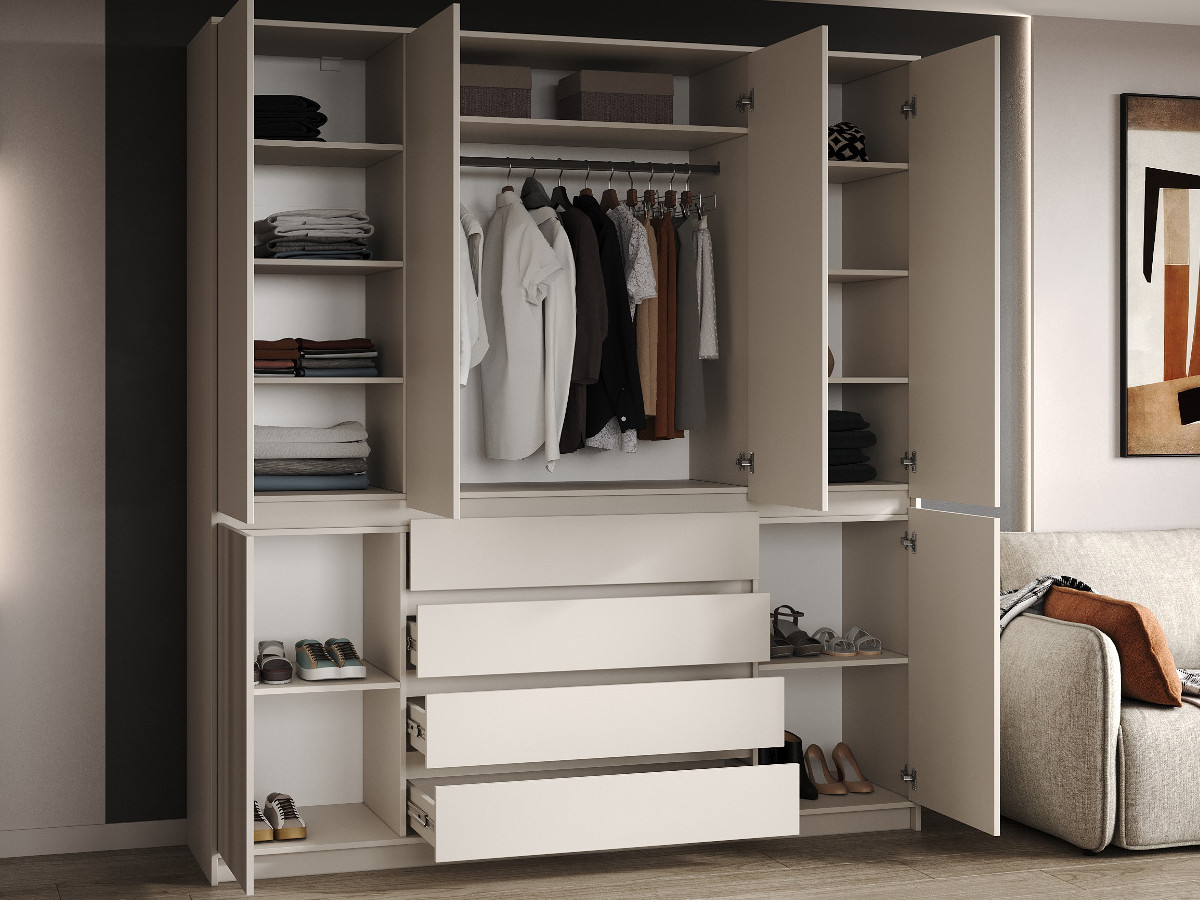 - Верхняя часть шкафа закрывается створками ЛДСП в цвет корпуса, нижняя фасадами МДФ с фрезеровкой. Створки, которые устанавливаются на перегородки, комплектуются полунакладными петлями. На боковины створки крепятся внутренними петлями.
