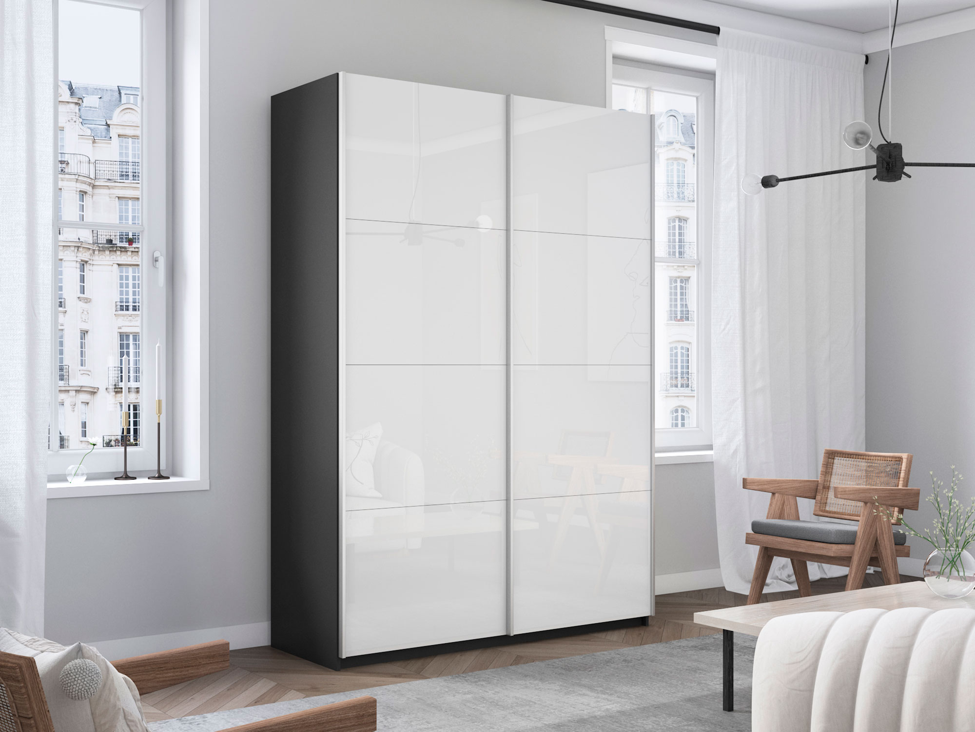 - Усиленная навесная система дверей помогает ходовому профилю выдерживать высокие нагрузки, а также сохраняет полезную площадь внутри шкафа, благодаря установке снаружи корпуса