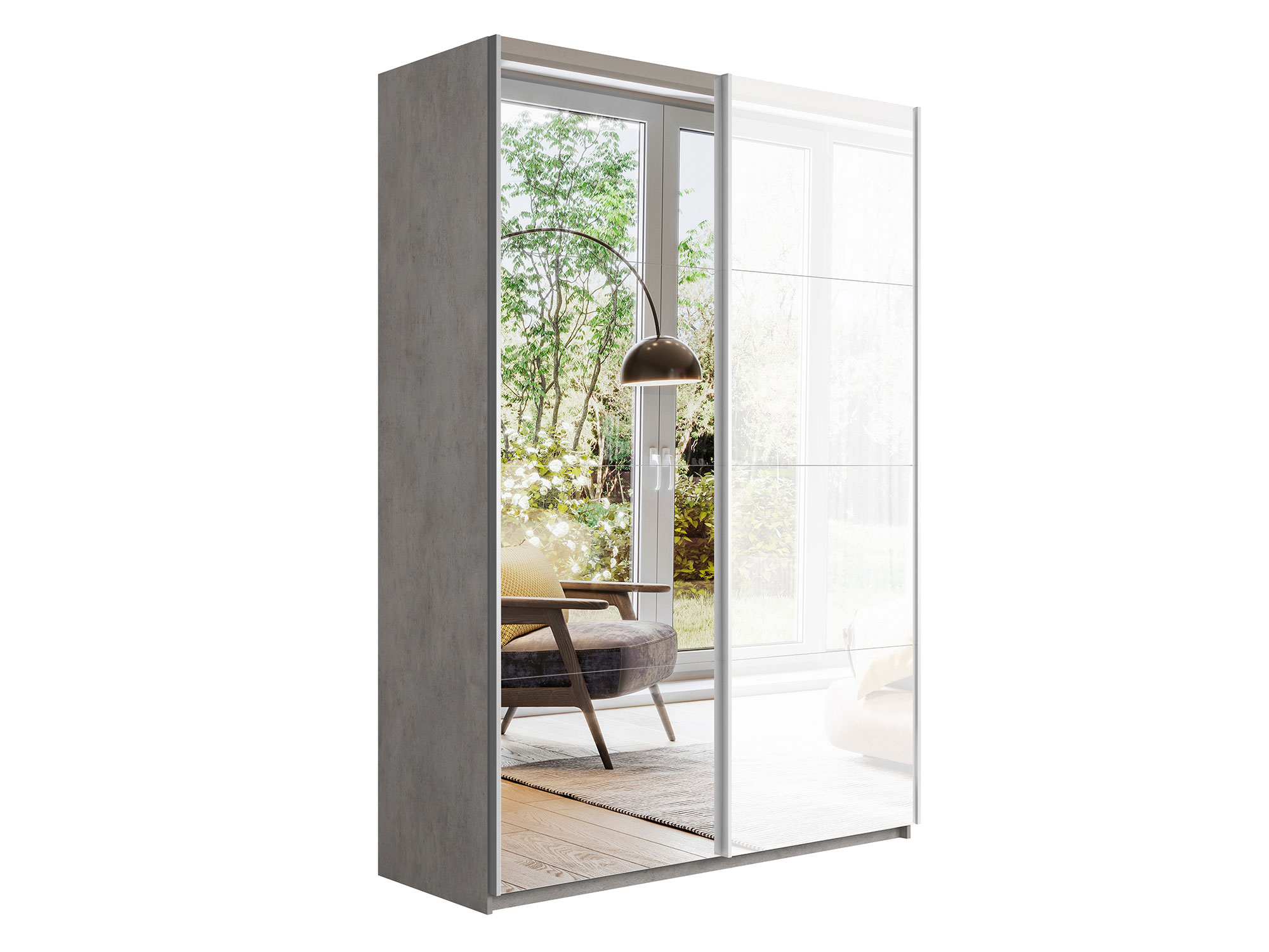 - Шкаф-купе Прайм 2-х дверный 1200 Зеркало/Стекло Белое Бетон