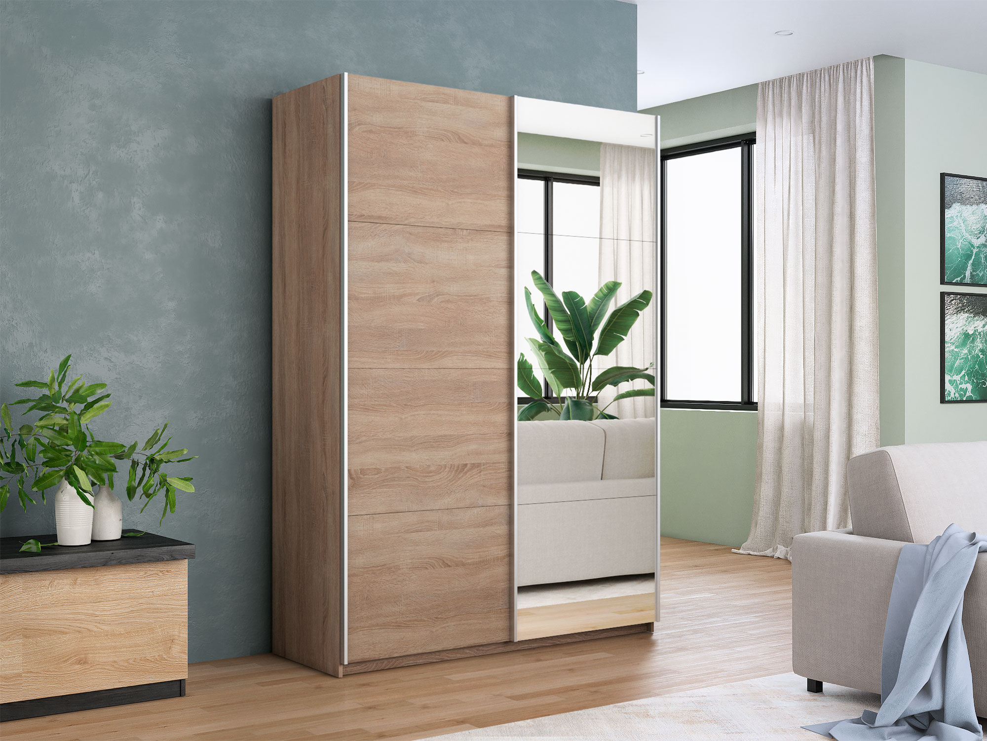- Шкаф-купе Прайм 2-х дверный 1600 Зеркало/ДСП Сонома