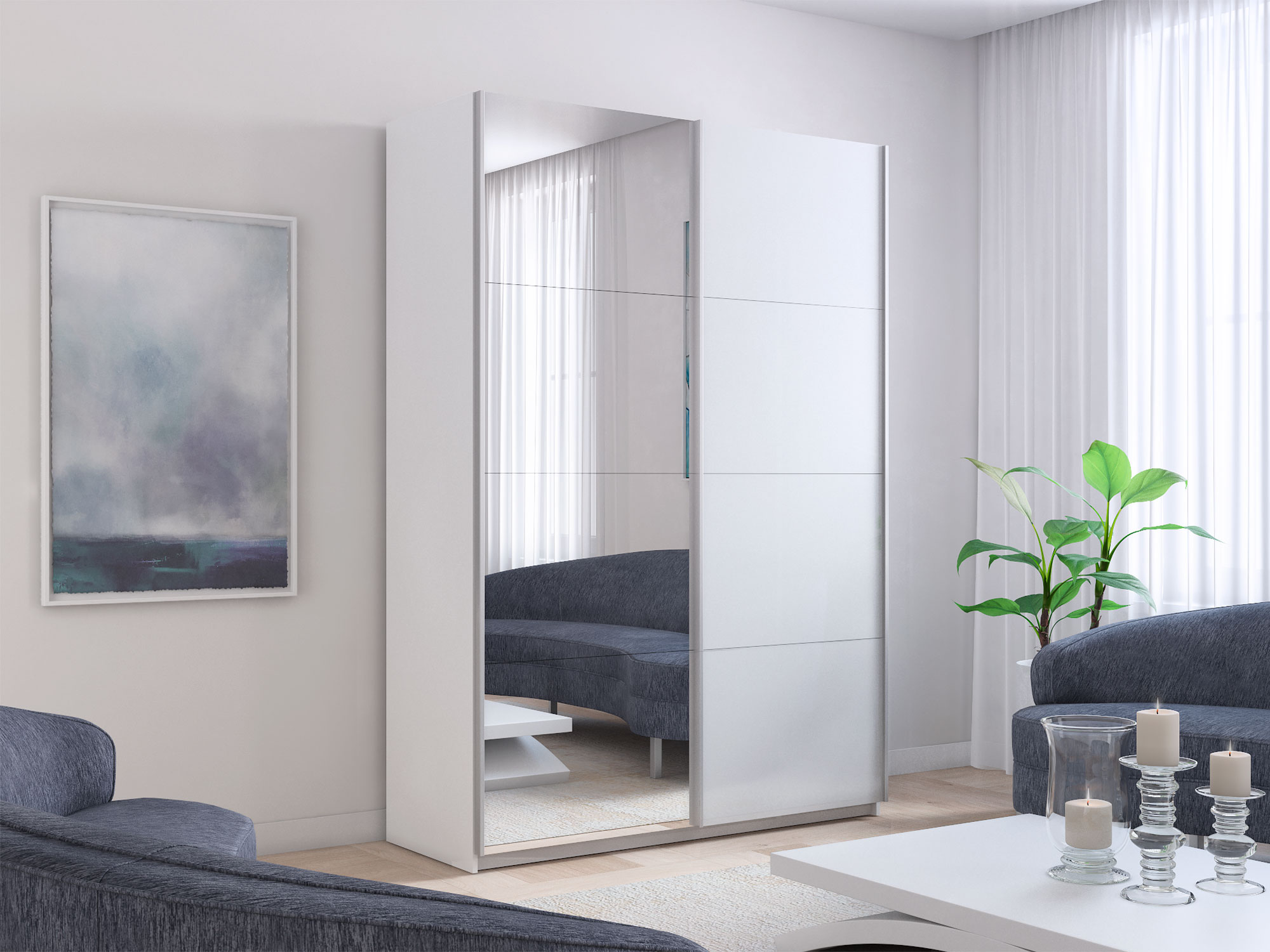 - Шкаф-купе Прайм 2-х дверный 1600 Зеркало/Стекло Белое Белый Снег