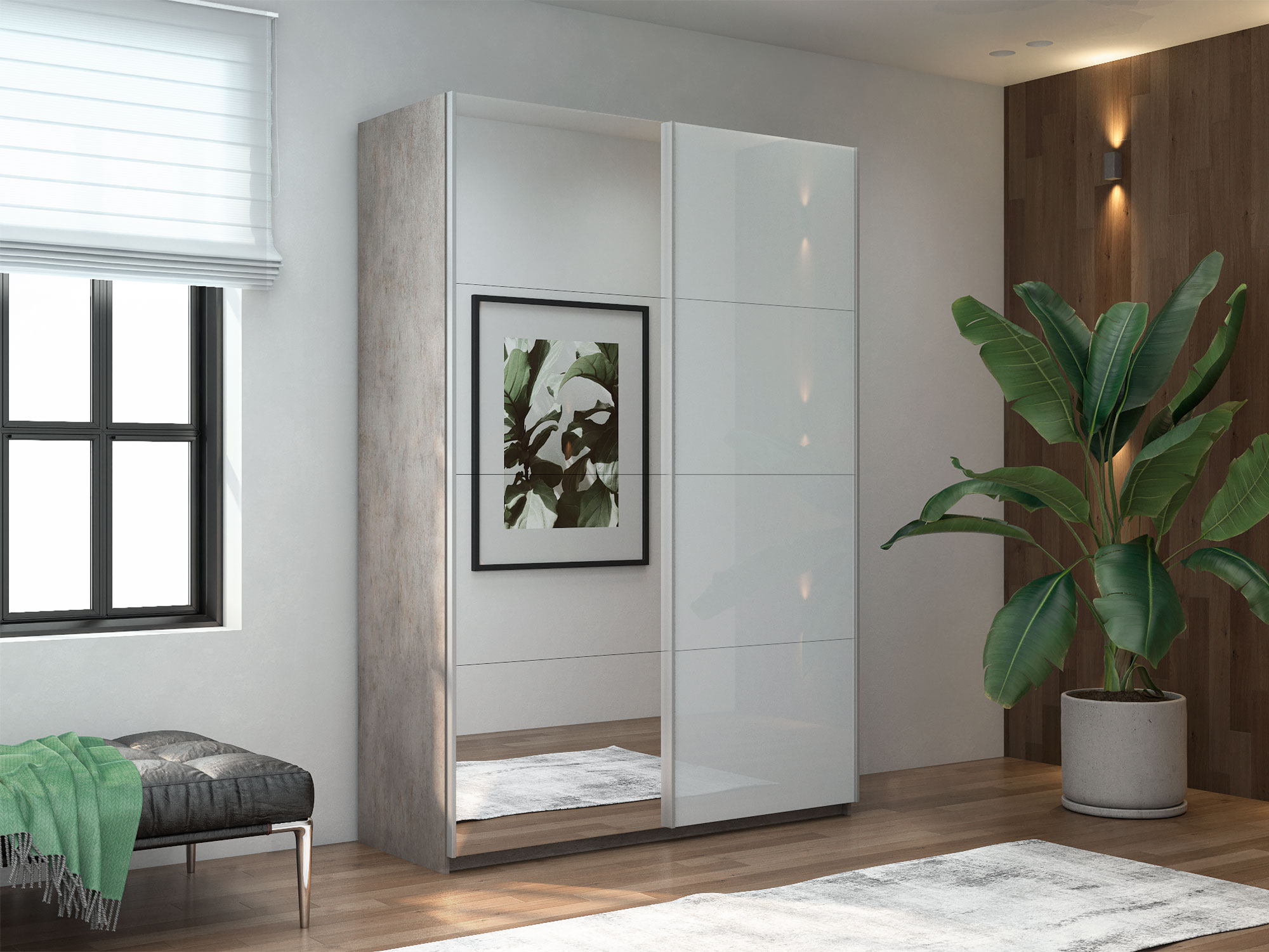 - Шкаф-купе Прайм 2-х дверный 1600 Зеркало/Стекло Белое Бетон