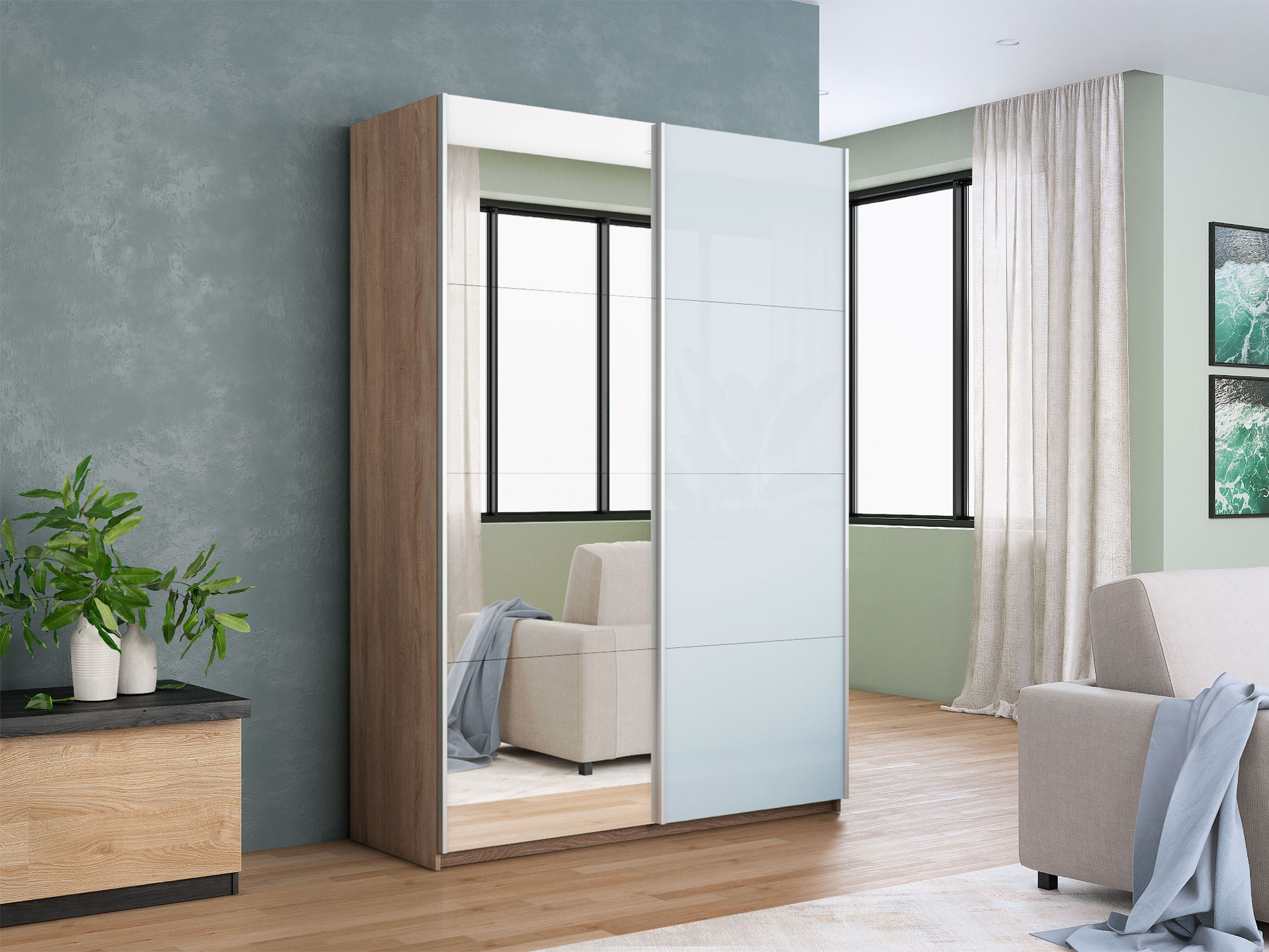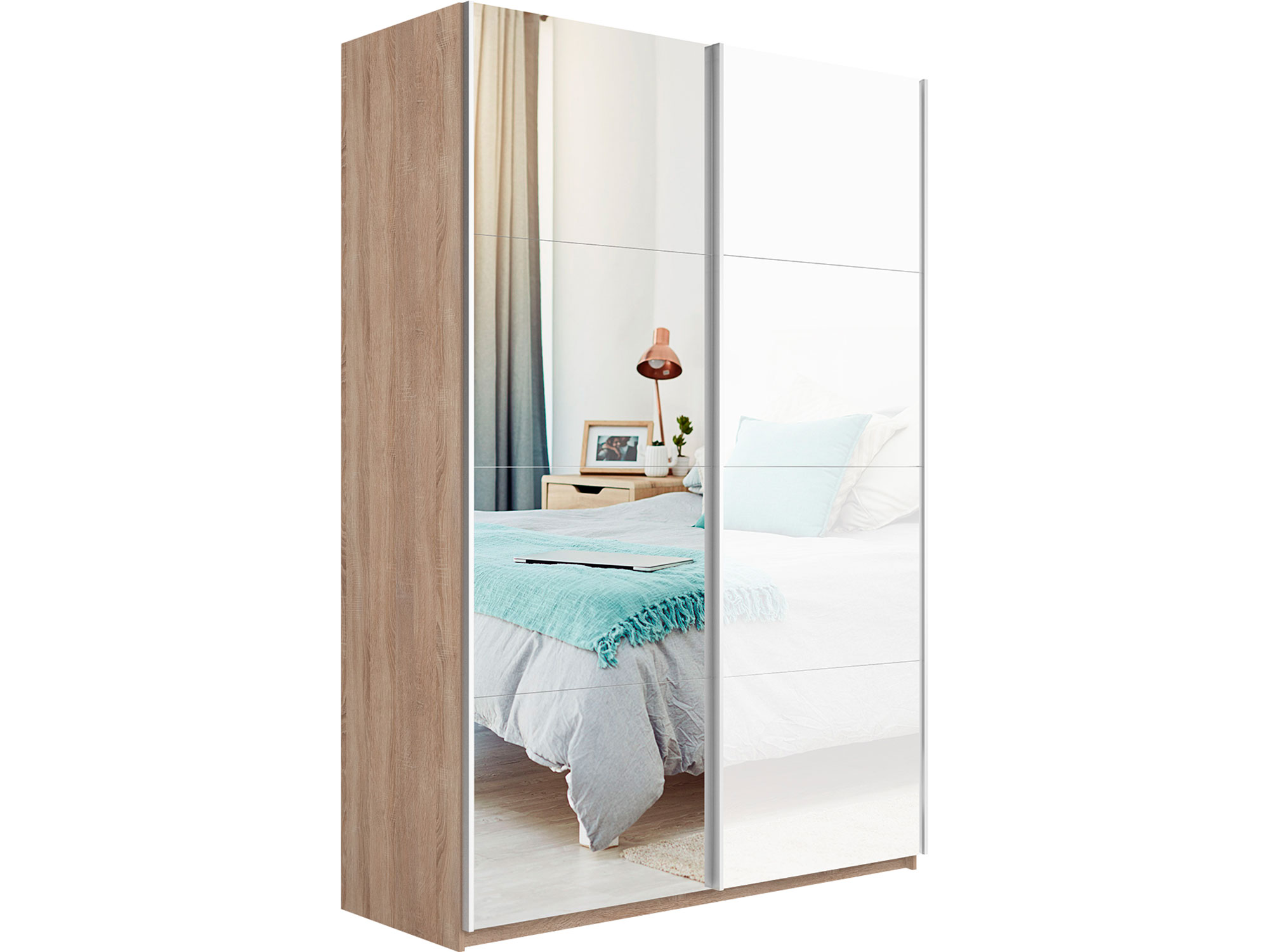 - Шкаф-купе Прайм 2-х дверный 1600 Зеркало/Стекло Белое Сонома