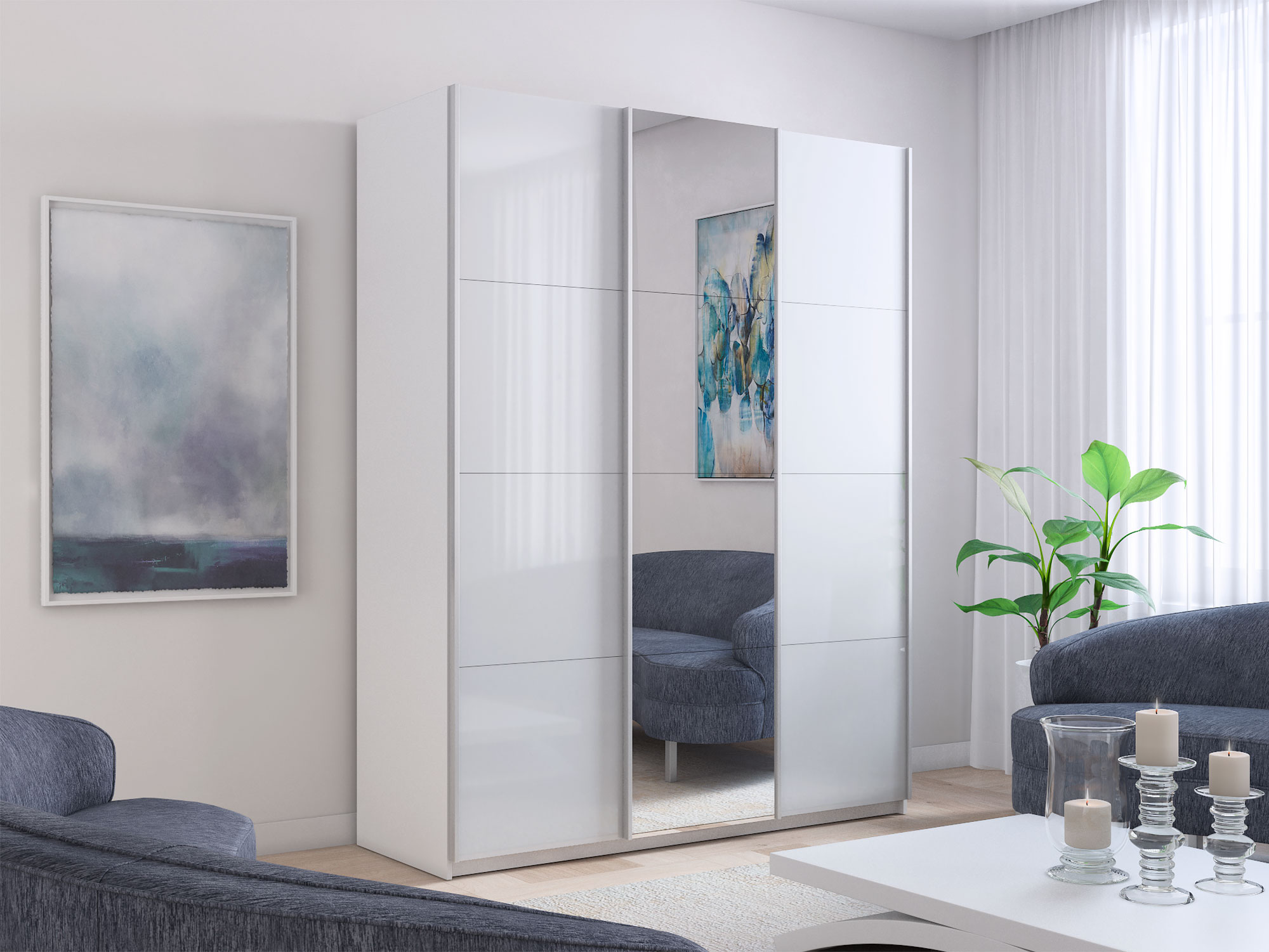Шкаф-купе Прайм 3-х дверный 1800 два Стекла Белые/Зеркало Белый Снег