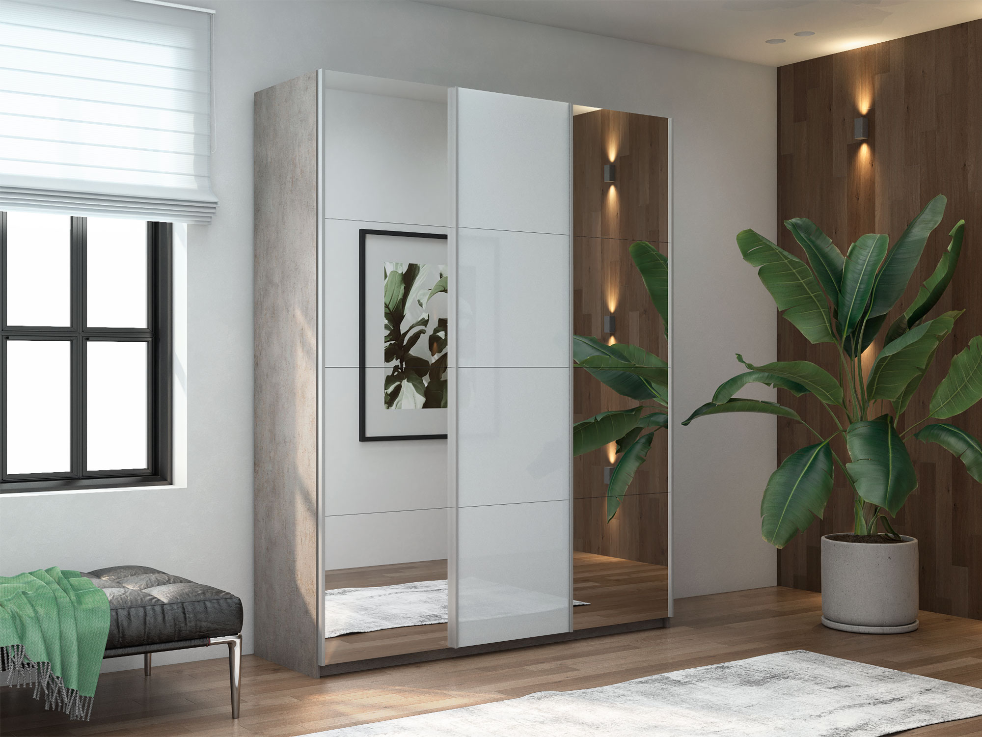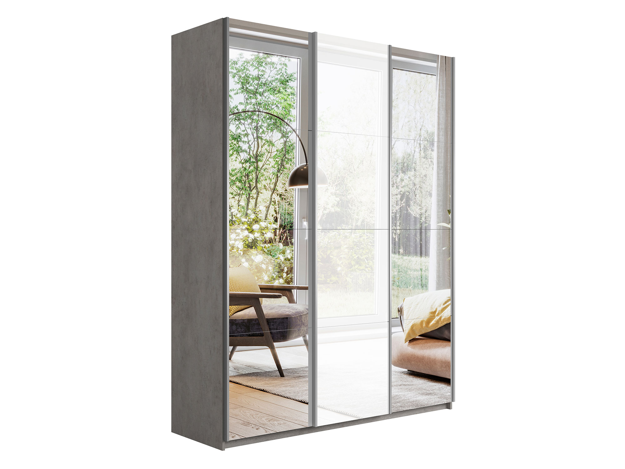 Шкаф-купе Прайм 3-х дверный 1800 Зеркало/Стекло Белое/Зеркало Бетон
