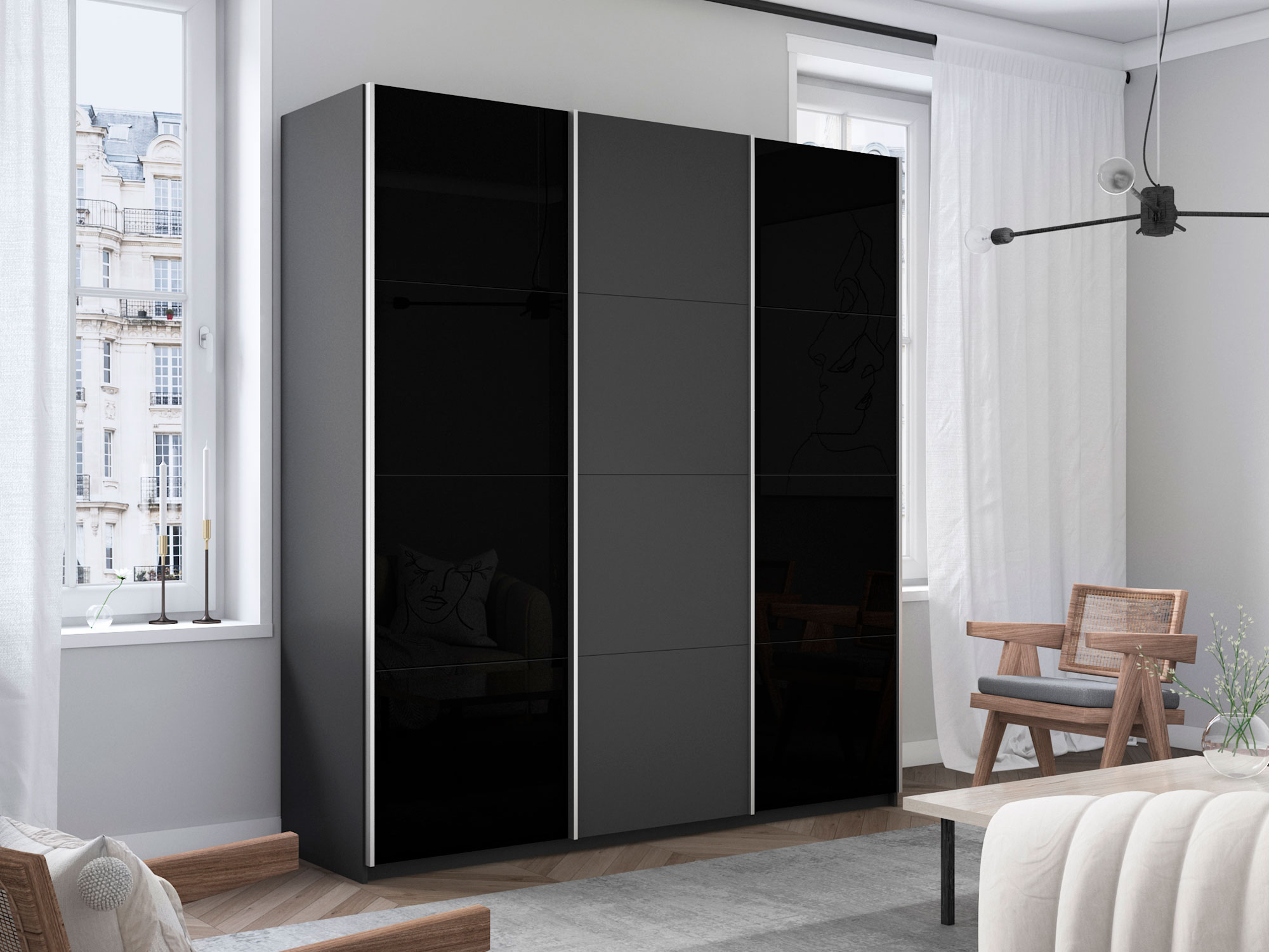 Шкаф-купе Прайм 3-х дверный 2100 два Стекла Черные/ДСП Серый Диамант